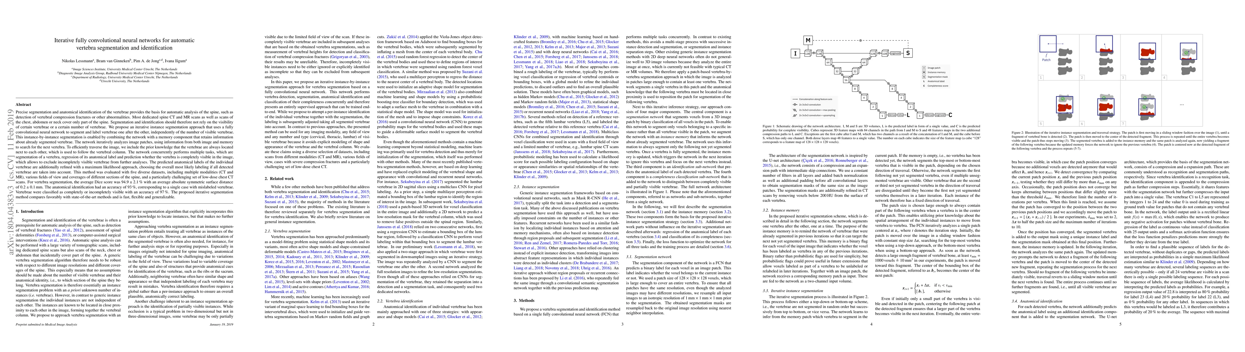 This paper proposes an iterative fully convolutional neural network for automatic vertebra segmentation and identification, which segments vertebrae independently of their visibility. The method uses an instance segmentation approach combined with a memory component to retain information about already segmented vertebrae, enabling efficient traversal of the image.