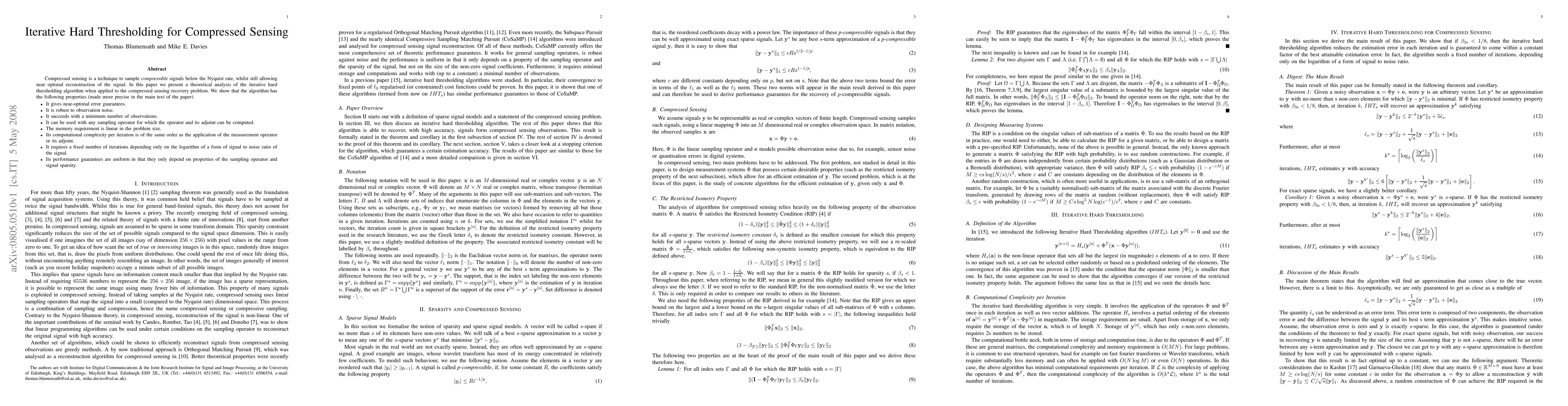 This paper presents a theoretical analysis of the iterative hard thresholding algorithm for compressed sensing, demonstrating near-optimal error guarantees, robustness to noise, and efficient computational properties, including linear memory requirements and a fixed number of iterations based on signal-to-noise ratio.