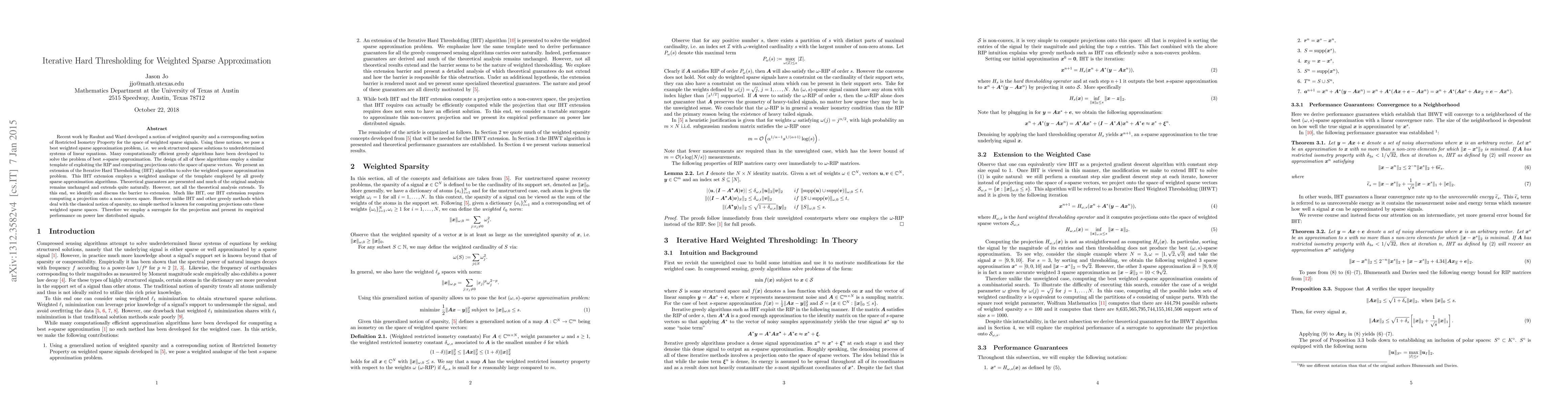 This paper extends the Iterative Hard Thresholding (IHT) algorithm to solve the weighted sparse approximation problem, leveraging the notion of weighted sparsity and Restricted Isometry Property. It introduces a surrogate method for computing projections onto weighted sparse spaces due to the lack of a simple projection technique.