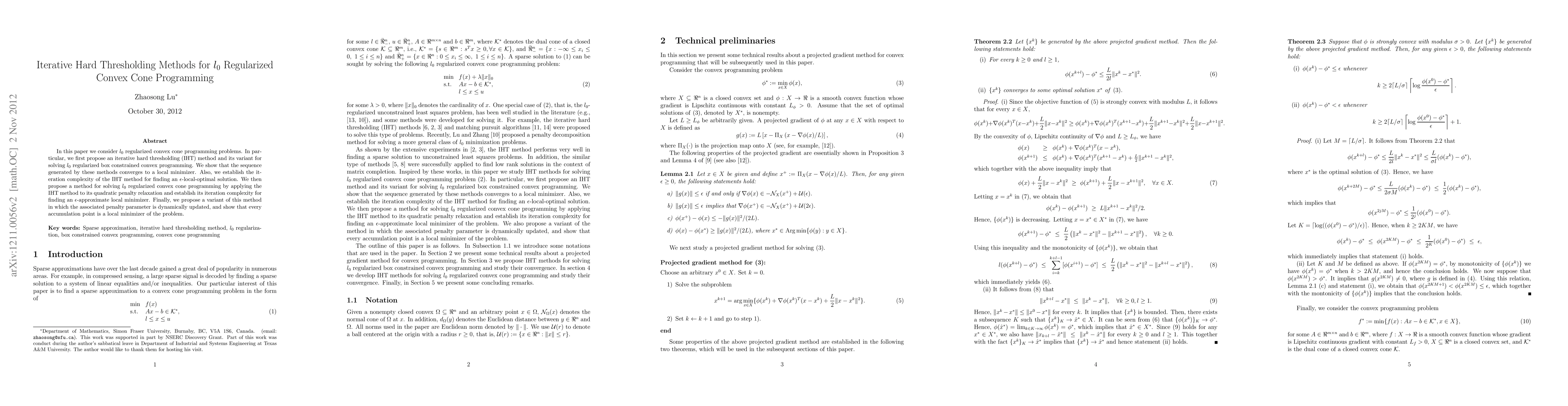 This paper proposes iterative hard thresholding methods for solving $l_0$ regularized convex cone programming problems, demonstrating convergence to local minimizers and establishing iteration complexities. It also introduces a dynamically updated variant to ensure every accumulation point is a local minimizer.