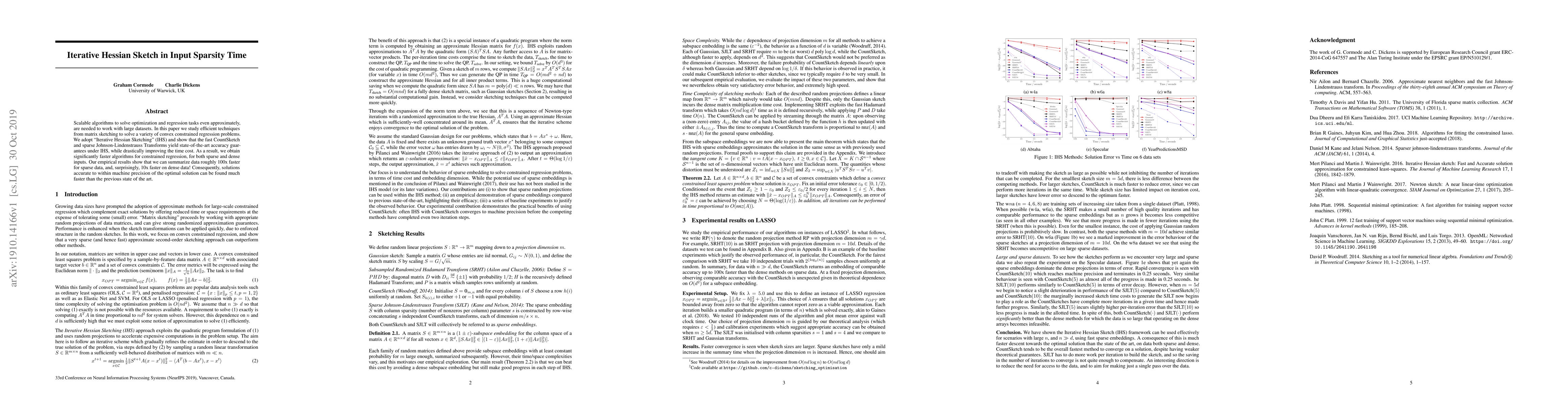 This paper introduces Iterative Hessian Sketching (IHS), a method using CountSketch and sparse JLT for efficient matrix sketching in regression problems. IHS significantly speeds up algorithms for both sparse and dense data, achieving high accuracy with summaries created 100x faster for sparse and 10x faster for dense inputs compared to previous methods.