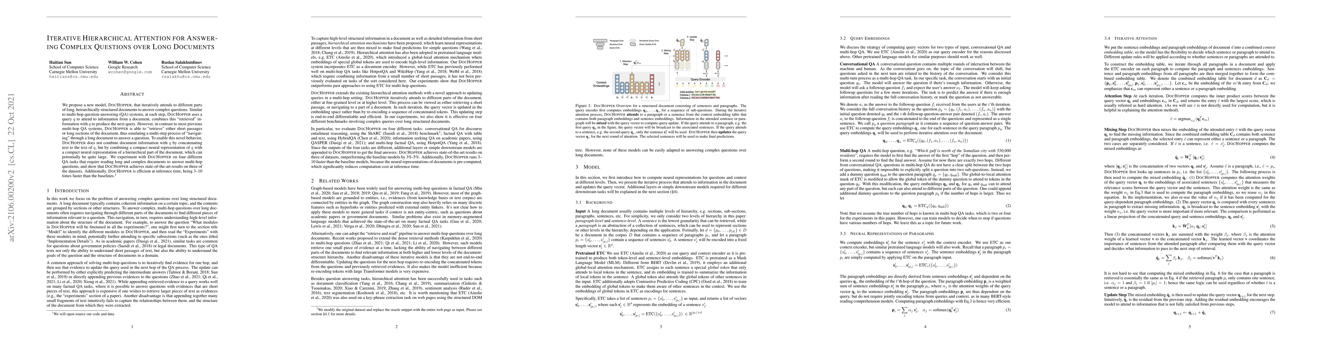 DocHopper is an iterative model that navigates hierarchically structured long documents to answer complex questions by attending to both short passages and large sections, achieving state-of-the-art results on multiple multi-hop question-answering tasks while being significantly faster than baselines.