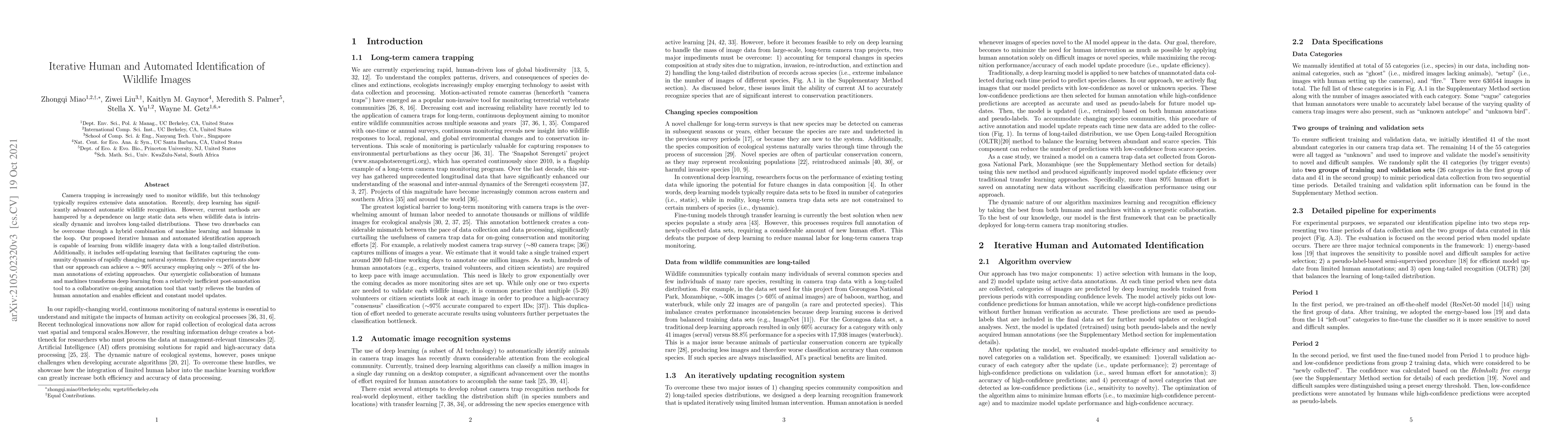 This paper proposes an iterative method combining human and automated identification to improve wildlife image recognition using camera traps. It achieves high accuracy (~90%) with minimal human annotations (~20%) by leveraging self-updating machine learning to adapt to dynamic wildlife data distributions.