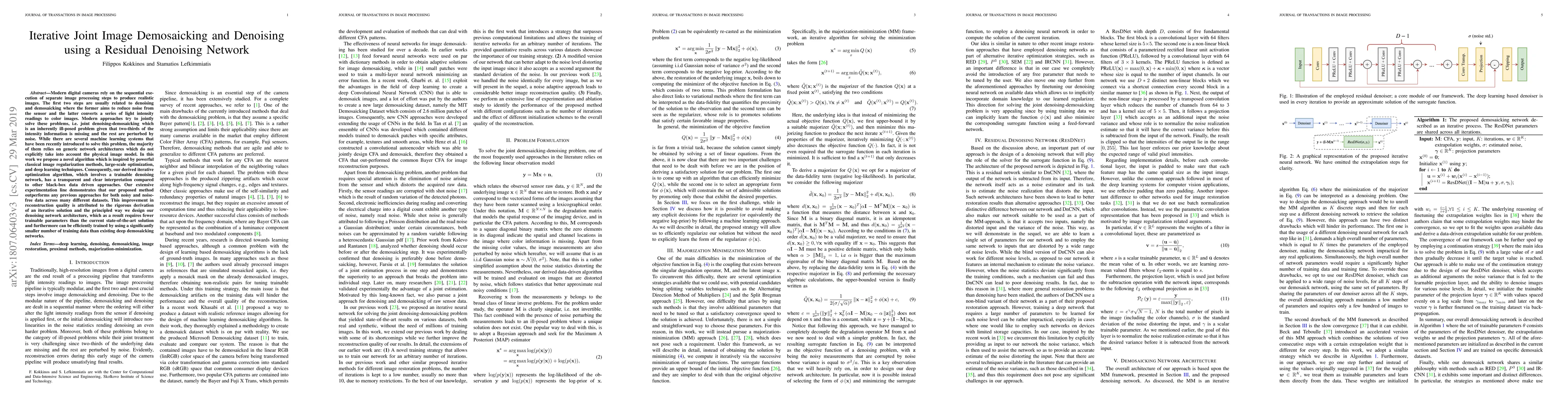 This paper proposes an iterative joint image demosaicking and denoising method using a residual denoising network, which is inspired by classical regularization and deep learning. The method outperforms existing approaches by leveraging a principled network design and requiring fewer parameters, thus needing less training data.