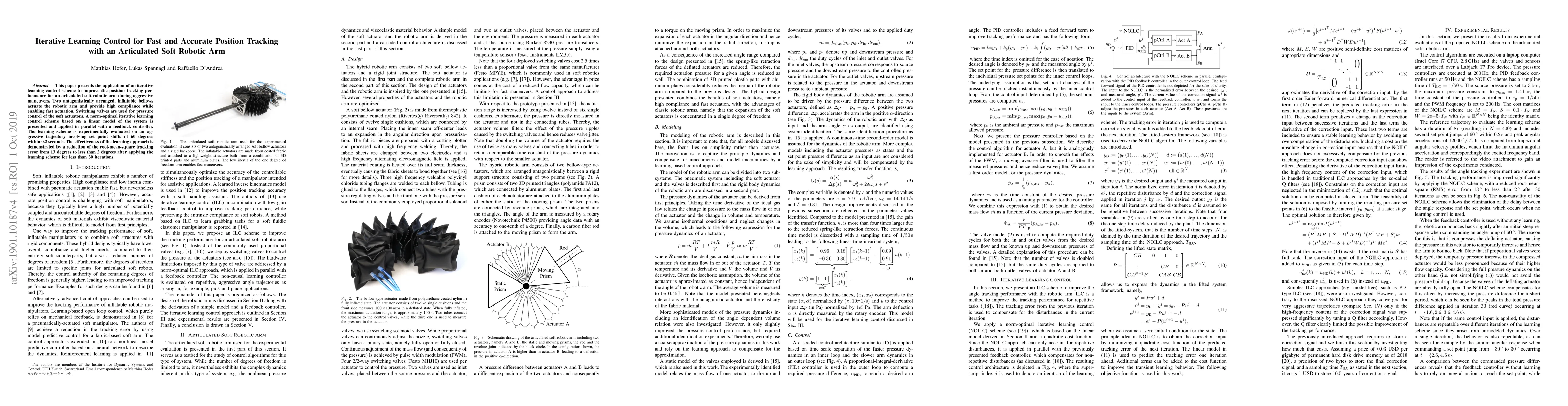 This paper applies an iterative learning control scheme to enhance position tracking for an articulated soft robotic arm, achieving significant error reduction from 13 degrees to under 2 degrees after fewer than 30 iterations during aggressive maneuvers. The control scheme is based on a linear model and complements a feedback controller.