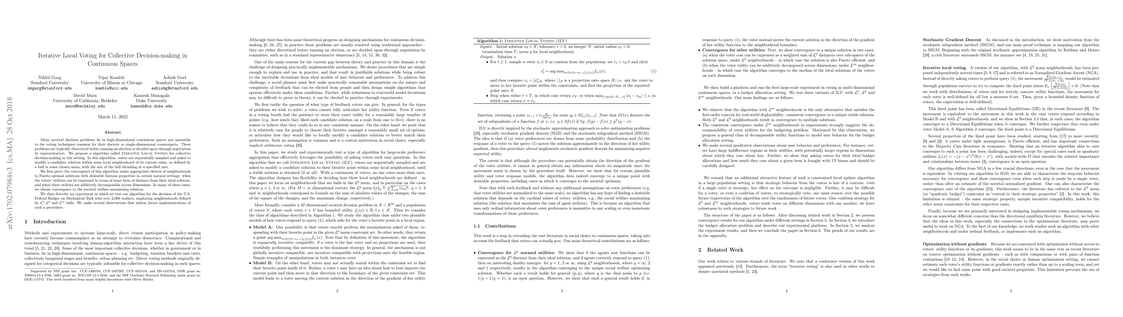 This paper proposes an Iterative Local Voting algorithm for collective decision-making in high-dimensional continuous spaces, where voters sequentially modify a candidate solution within shrinking neighborhoods. The algorithm is proven to converge to Pareto optimal solutions, particularly maximizing societal welfare under certain conditions. An experiment on the U.S. Federal Budget using Mechanical Turk demonstrates the algorithm's practical application and informs future implementations.