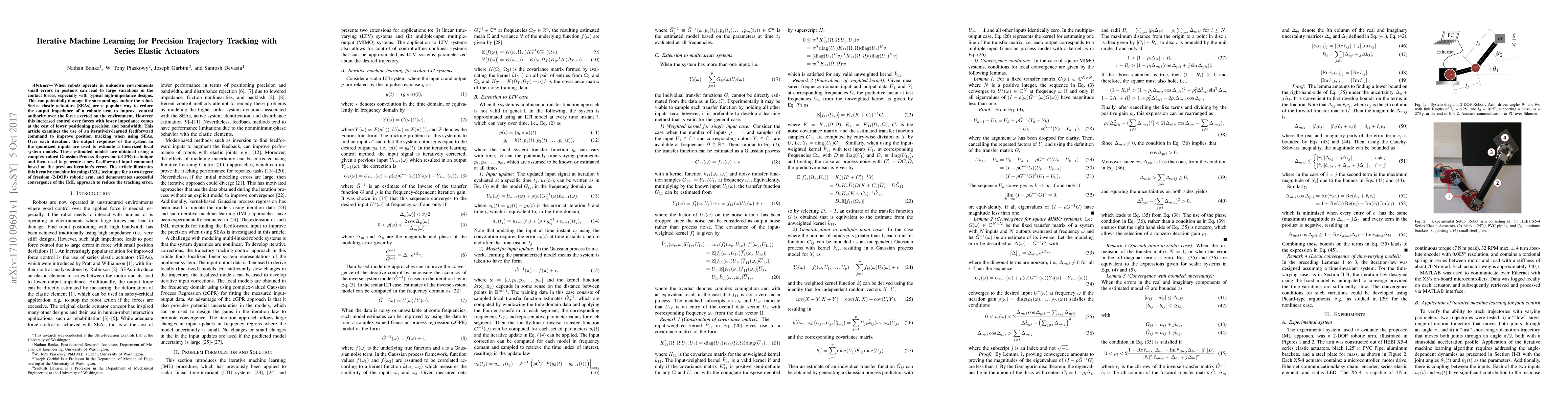 When robots operate in unknown environments small errors in postions can lead to large variations in the contact forces, especially with typical high-impedance designs. This can potentially damage the surroundings and/or the robot. Series elastic actuators (SEAs) are a popular way to reduce the output impedance of a robotic arm to improve control authority over the force exerted on the environment. However this increased control over forces with lower impedance comes at the cost of lower positioning precision and bandwidth. This article examines the use of an iteratively-learned feedforward command to improve position tracking when using SEAs. Over each iteration, the output responses of the system to the quantized inputs are used to estimate a linearized local system models. These estimated models are obtained using a complex-valued Gaussian Process Regression (cGPR) technique and then, used to generate a new feedforward input command based on the previous iteration's error. This article illustrates this iterative machine learning (IML) technique for a two degree of freedom (2-DOF) robotic arm, and demonstrates successful convergence of the IML approach to reduce the tracking error.
