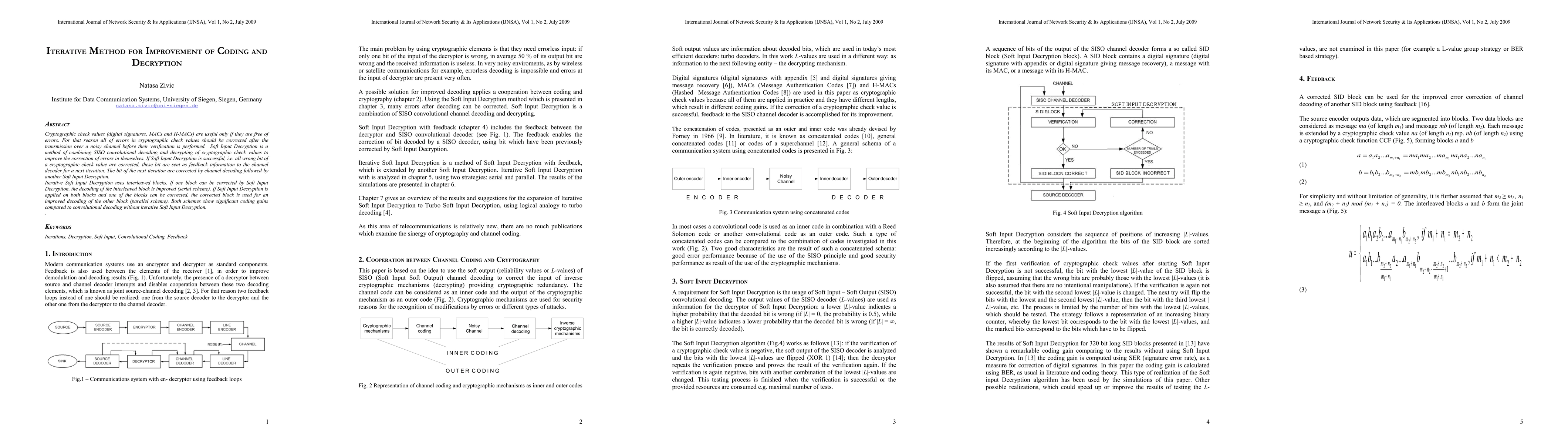 This paper proposes an iterative method combining Soft Input Decryption with convolutional decoding to correct errors in cryptographic check values transmitted over noisy channels. The method shows significant coding gains through iterative decoding and feedback, using both serial and parallel schemes for interleaved blocks.