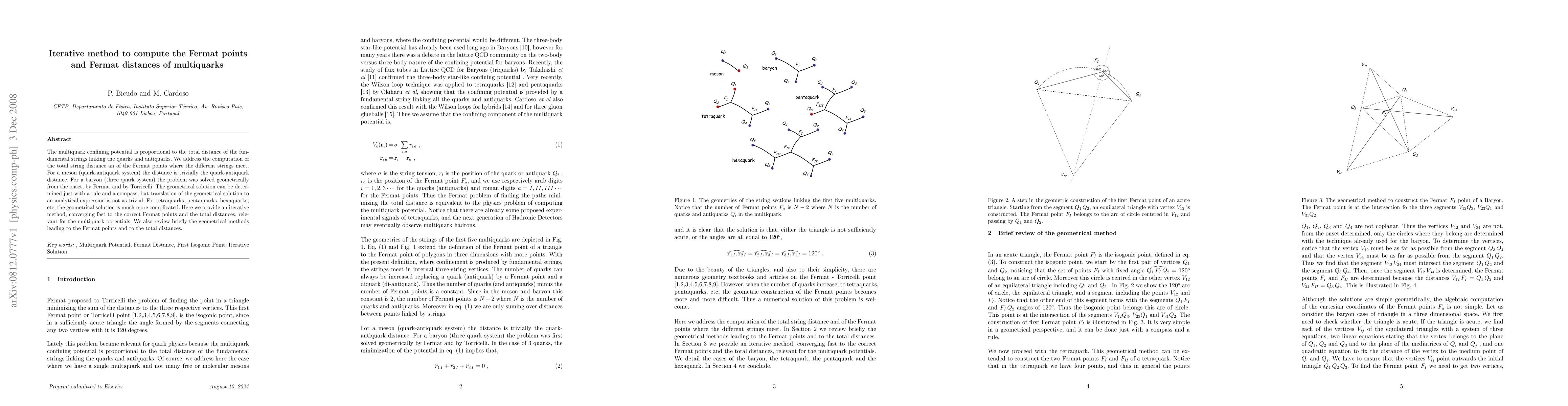 The multiquark confining potential is proportional to the total distance of the fundamental strings linking the quarks and antiquarks. We address the computation of the total string distance an of the Fermat points where the different strings meet. For a meson (quark-antiquark system) the distance is trivially the quark-antiquark distance. For a baryon (three quark system) the problem was solved geometrically from the onset, by Fermat and by Torricelli. The geometrical solution can be determined just with a rule and a compass, but translation of the geometrical solution to an analytical expression is not as trivial. For tetraquarks, pentaquarks, hexaquarks, etc, the geometrical solution is much more complicated. Here we provide an iterative method, converging fast to the correct Fermat points and the total distances, relevant for the multiquark potentials. We also review briefly the geometrical methods leading to the Fermat points and to the total distances.