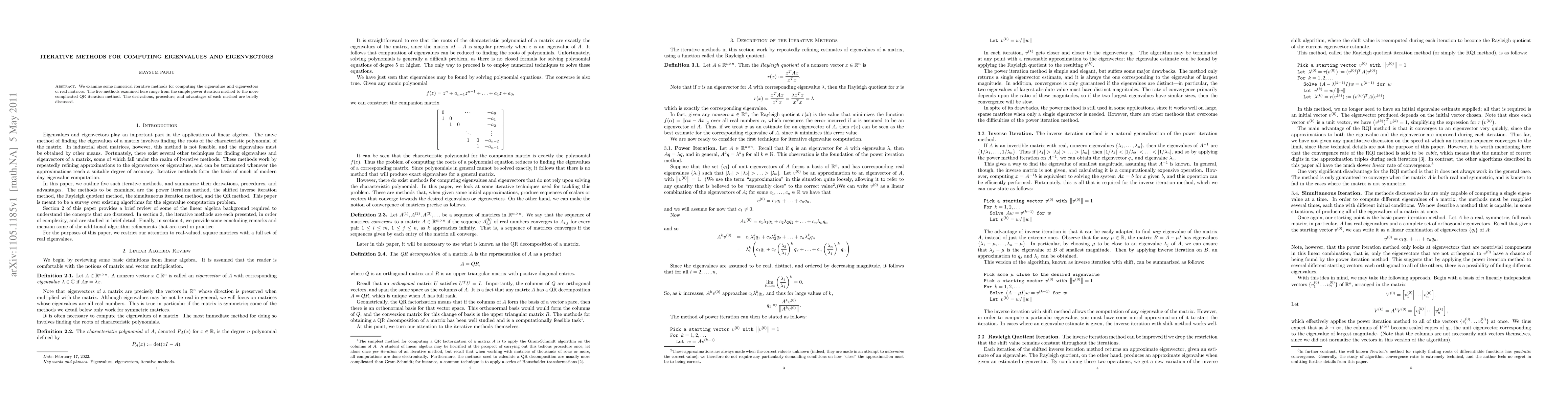 This paper investigates five numerical iterative methods for determining eigenvalues and eigenvectors of real matrices, ranging from the straightforward power iteration to the complex QR iteration, with a focus on their derivations, procedures, and respective advantages.