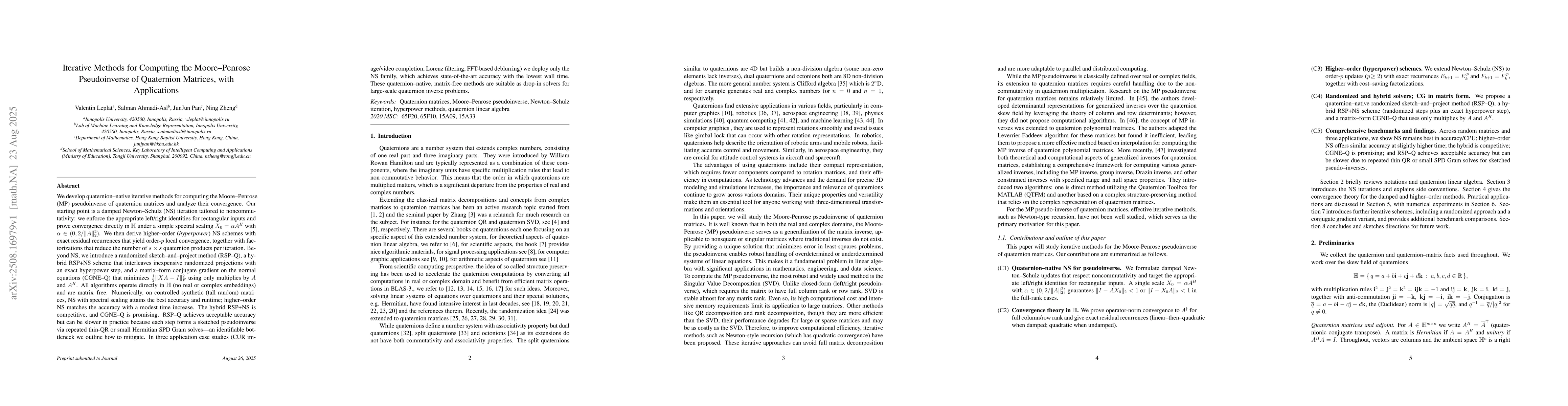 We develop iterative methods to compute the Moore-Penrose pseudoinverse of quaternion matrices directly in $\mathbb{H}$. We introduce a damped Newton-Schulz (NS) iteration, proving its convergence under spectral scaling $X_0=\alpha A^H$ with $\alpha\in(0,2/\|A\|_2^2)$. We derive higher-order hyperpower NS schemes with optimized factorizations. Beyond NS, we propose a randomized sketch-and-project method (RSP-Q) and a conjugate gradient on normal equations (CGNE-Q). Numerically, spectrally-scaled NS achieves superior accuracy and runtime. In applications (image completion, filtering, deblurring), the NS family delivers state-of-the-art performance with the lowest wall time, providing efficient solvers for large-scale quaternion inverse problems.