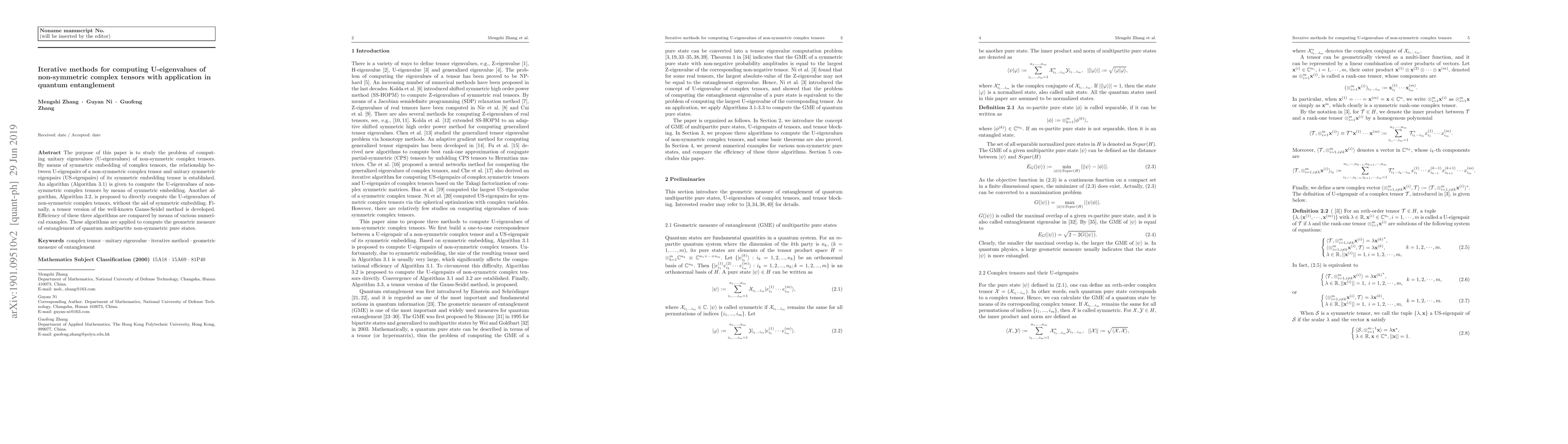 This paper proposes algorithms for computing unitary eigenvalues (U-eigenvalues) of non-symmetric complex tensors, establishing a relationship between U-eigenpairs and unitary symmetric eigenpairs via symmetric embedding. The study applies these algorithms to compute the geometric measure of entanglement in quantum multipartite states.
