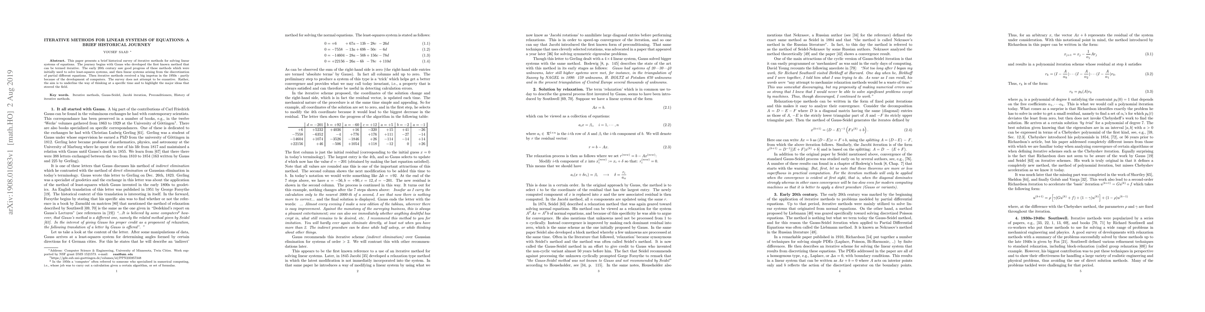This paper presents a brief historical survey of iterative methods for solving linear systems of equations. The journey begins with Gauss who developed the first known method that can be termed iterative. The early 20th century saw good progress of these methods which were initially used to solve least-squares systems, and then linear systems arising from the discretization of partial different equations. Then iterative methods received a big impetus in the 1950s - partly because of the development of computers. The survey does not attempt to be exhaustive. Rather, the aim is to underline the way of thinking at a specific time and to highlight the major ideas that steered the field.