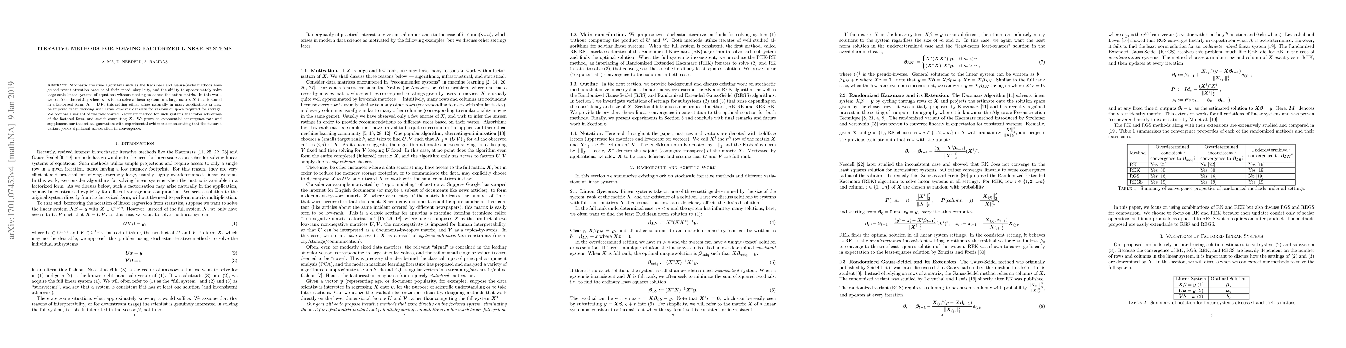 Stochastic iterative algorithms such as the Kaczmarz and Gauss-Seidel methods have gained recent attention because of their speed, simplicity, and the ability to approximately solve large-scale linear systems of equations without needing to access the entire matrix. In this work, we consider the setting where we wish to solve a linear system in a large matrix X that is stored in a factorized form, X = UV; this setting either arises naturally in many applications or may be imposed when working with large low-rank datasets for reasons of space required for storage. We propose a variant of the randomized Kaczmarz method for such systems that takes advantage of the factored form, and avoids computing X. We prove an exponential convergence rate and supplement our theoretical guarantees with experimental evidence demonstrating that the factored variant yields significant acceleration in convergence.