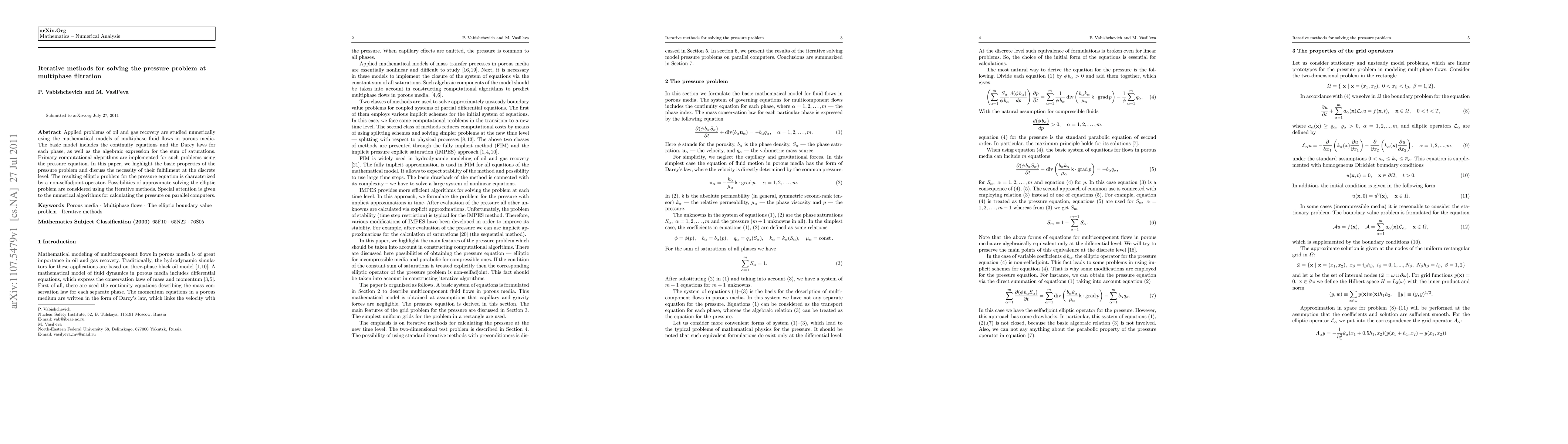 This paper numerically investigates oil and gas recovery issues using mathematical models of multiphase fluid flows in porous media. It focuses on pressure problem properties and solution via iterative methods on parallel computers, addressing the non-selfadjoint operator characteristic of the elliptic pressure equation.