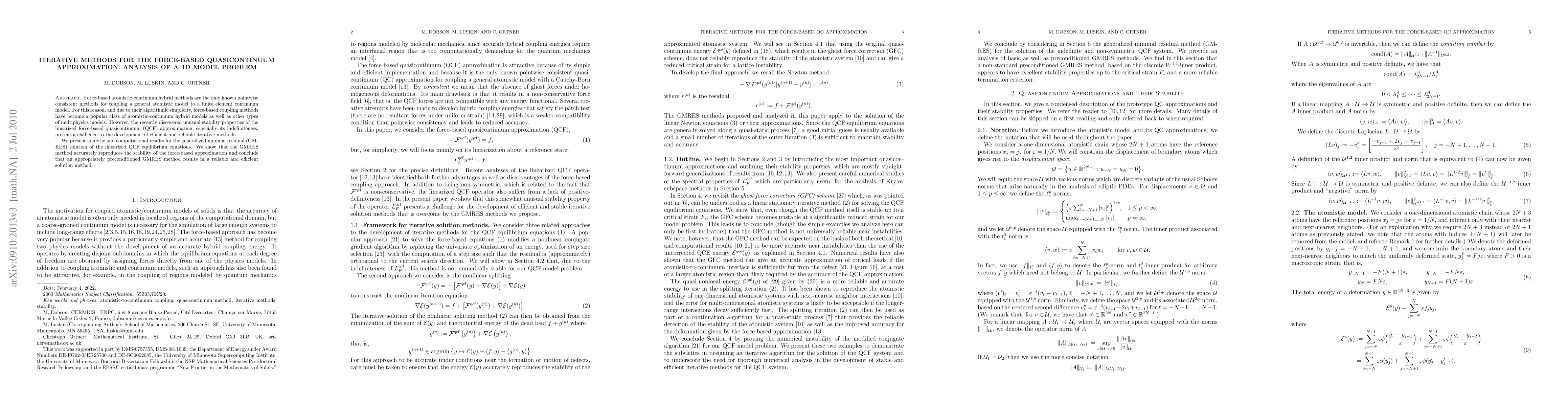 This paper investigates the iterative solution of linearized force-based quasicontinuum (QCF) equilibrium equations using the generalized minimal residual (GMRES) method. The study finds that GMRES accurately captures the stability properties of the QCF approximation, concluding that a preconditioned GMRES method offers a reliable and efficient solution approach.