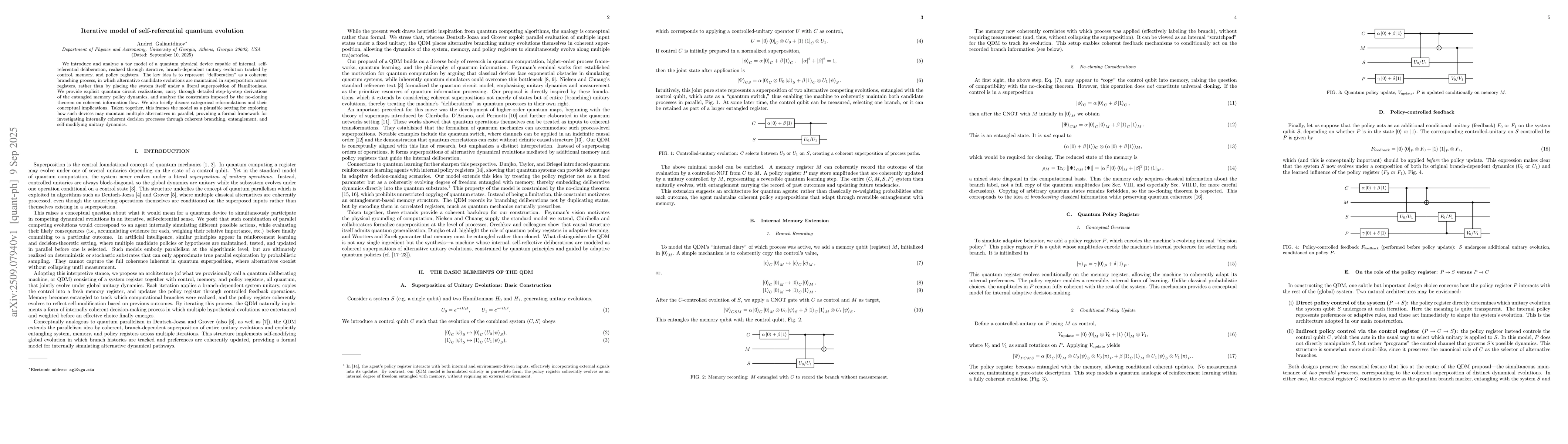 We introduce and analyze a toy model of a quantum physical device capable of internal, self-referential deliberation, realized through iterative, branch-dependent unitary evolution tracked by control, memory, and policy registers. The key idea is to represent ``deliberation'' as a coherent branching process, in which alternative candidate evolutions are maintained in superposition across registers, rather than by placing the system itself under a literal superposition of Hamiltonians. We provide explicit quantum circuit realizations, carry through detailed step-by-step derivations of the entangled memory--policy dynamics, and analyze the constraints imposed by the no-cloning theorem on coherent information flow. We also briefly discuss categorical reformulations and their conceptual implications. Taken together, this frames the model as a plausible setting for exploring how such devices may maintain multiple alternatives in parallel, providing a formal framework for investigating internally coherent decision processes through coherent branching, entanglement, and self-modifying unitary dynamics.