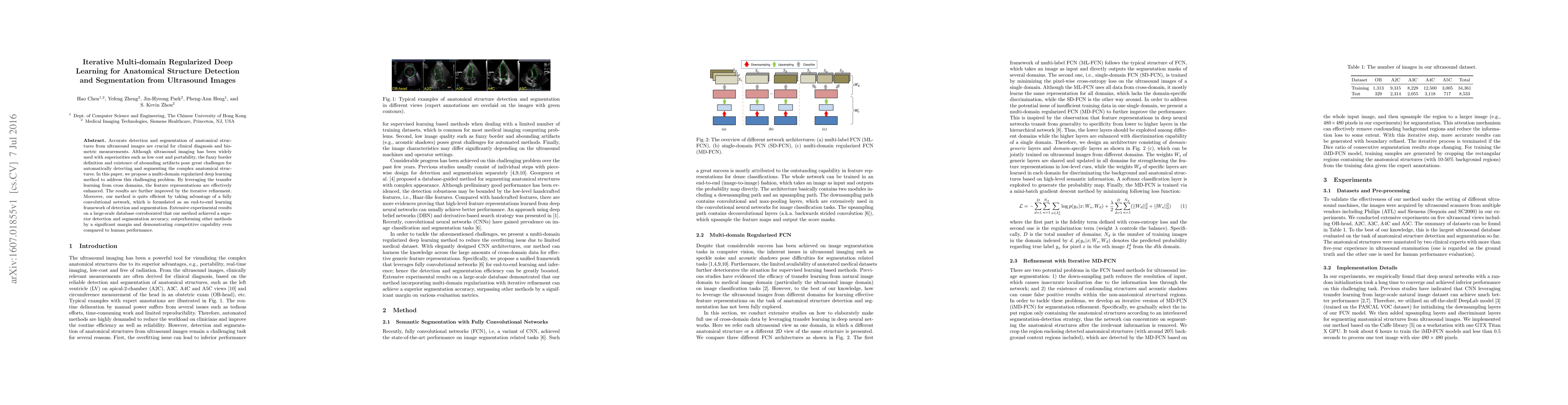 This paper proposes a multi-domain regularized deep learning method for detecting and segmenting anatomical structures in ultrasound images, leveraging transfer learning and iterative refinement. The fully convolutional network approach enhances feature representations and achieves superior accuracy, outperforming other methods and rivaling human performance.