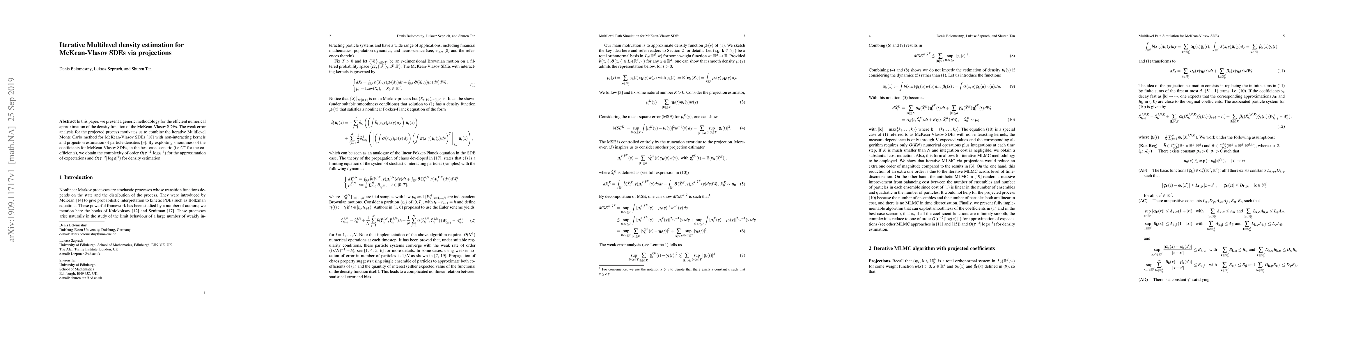 This paper proposes an efficient numerical method for approximating the density function of McKean-Vlasov stochastic differential equations (SDEs) by combining iterative Multilevel Monte Carlo techniques with projection estimation. The method achieves optimal complexity of order $O(\epsilon^{-2}|\log\epsilon|^4)$ for expectation approximation and $O(\epsilon^{-2}|\log\epsilon|^5)$ for density estimation under smooth coefficient conditions.