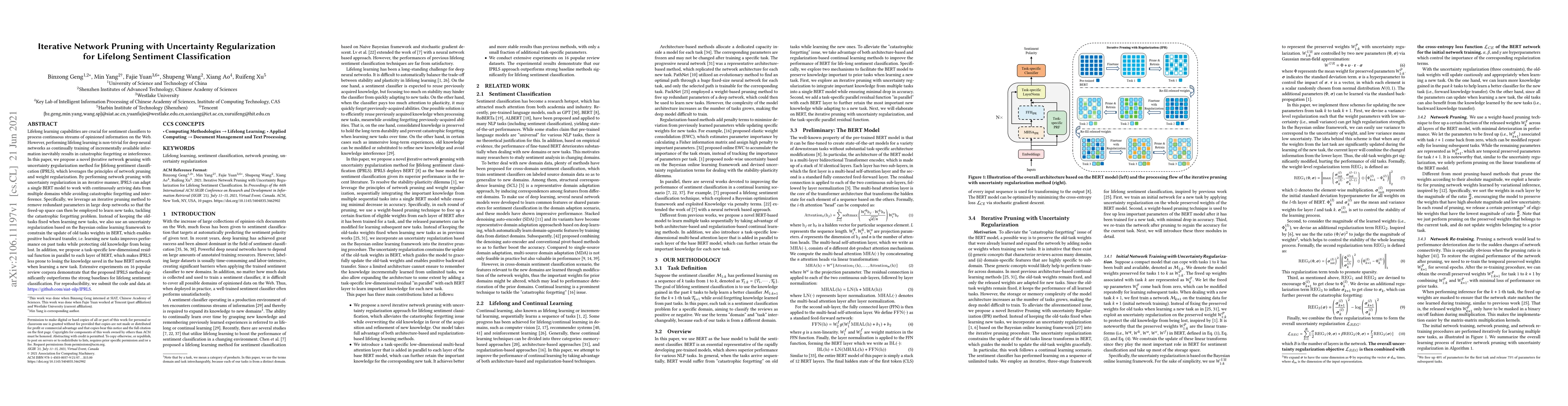 This paper proposes IPRLS, an iterative network pruning method with uncertainty regularization for lifelong sentiment classification, to address catastrophic forgetting in deep neural networks. IPRLS adapts a single BERT model to continuously learn from new data domains while preserving old knowledge, outperforming strong baselines in experiments on 16 review corpora.