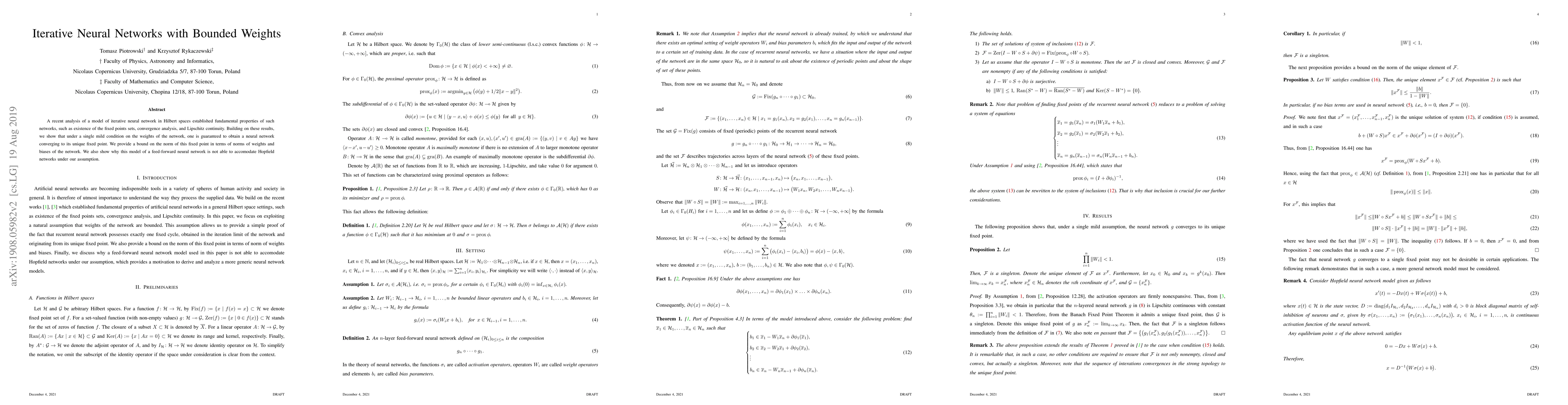 This paper establishes the convergence properties of iterative neural networks with bounded weights, proving the existence of unique fixed points and providing bounds on their norms. It also demonstrates the limitations of this model in accommodating Hopfield networks under the same weight constraints.