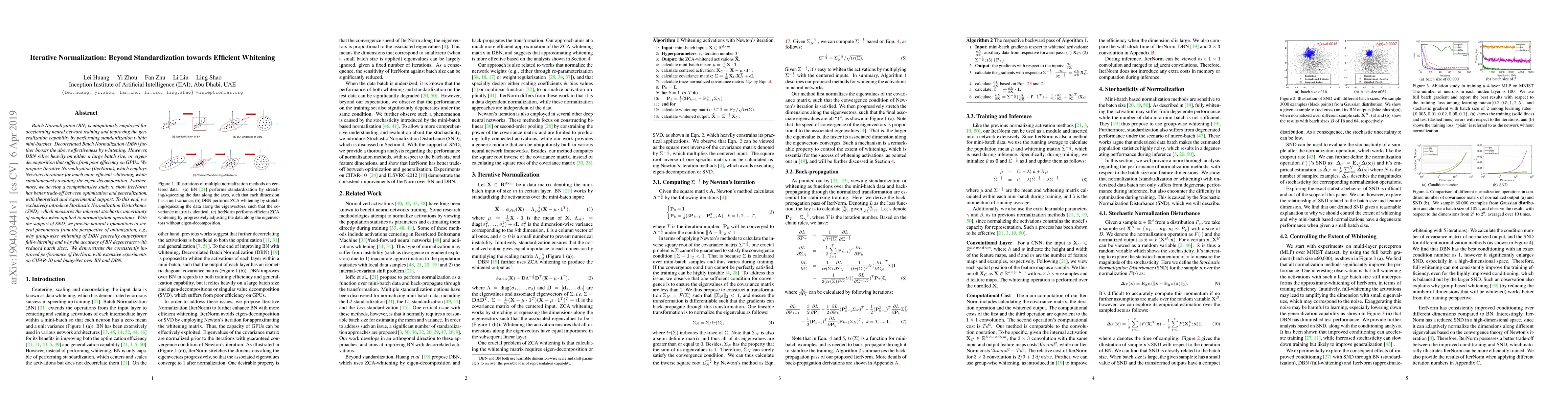 Iterative Normalization (IterNorm) improves upon Batch Normalization (BN) and Decorrelated Batch Normalization (DBN) by employing Newton's iterations for efficient whitening without relying on eigen-decomposition, thus enhancing both optimization and generalization. IterNorm introduces Stochastic Normalization Disturbance (SND) to explain phenomena like group-wise whitening's superiority and BN's performance degradation with smaller batch sizes.