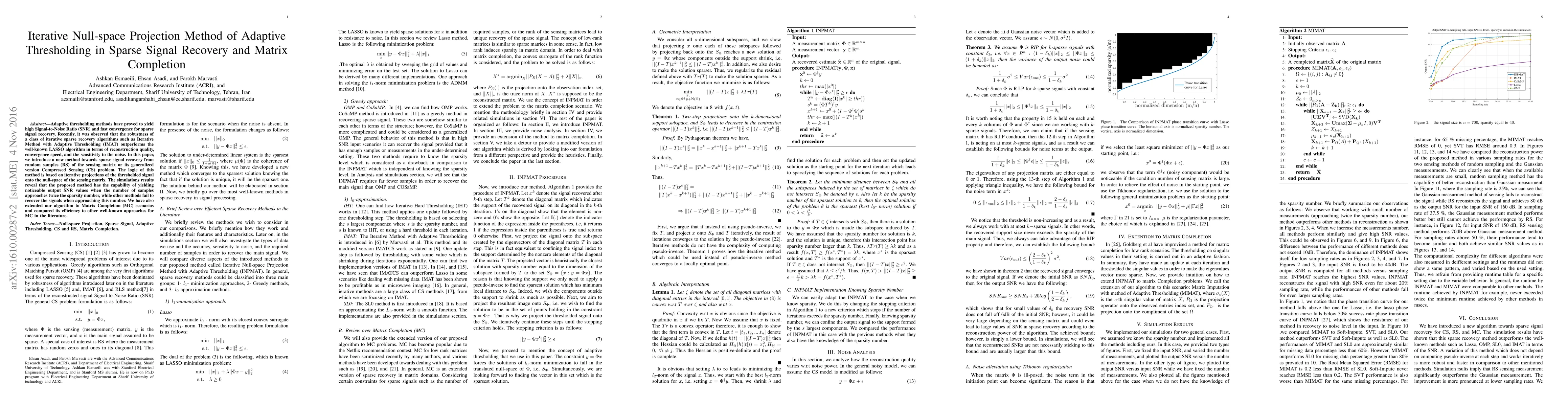 Adaptive thresholding methods have proved to yield high SNRs and fast convergence in finding the solution to the Compressed Sensing (CS) problems. Recently, it was observed that the robustness of a class of iterative sparse recovery algorithms such as Iterative Method with Adaptive Thresholding (IMAT) has outperformed the well-known LASSO algorithm in terms of reconstruction quality, convergence speed, and the sensitivity to the noise. In this paper, we introduce a new method towards solving the CS problem. The logic of this method is based on iterative projections of the thresholded signal onto the null-space of the sensing matrix. The thresholding is carried out by recovering the support of the desired signal by projection on thresholding subspaces. The simulations reveal that the proposed method has the capability of yielding noticeable output SNR values with about as many samples as twice the sparsity number, while other methods fail to recover the signals when approaching the algebraic bound for the number of samples required. The computational complexity of our method is also comparable to other methods as observed in the simulations. We have also extended our Algorithm to Matrix Completion (MC) scenarios and compared its efficiency to other well-reputed approaches for MC in the literature.