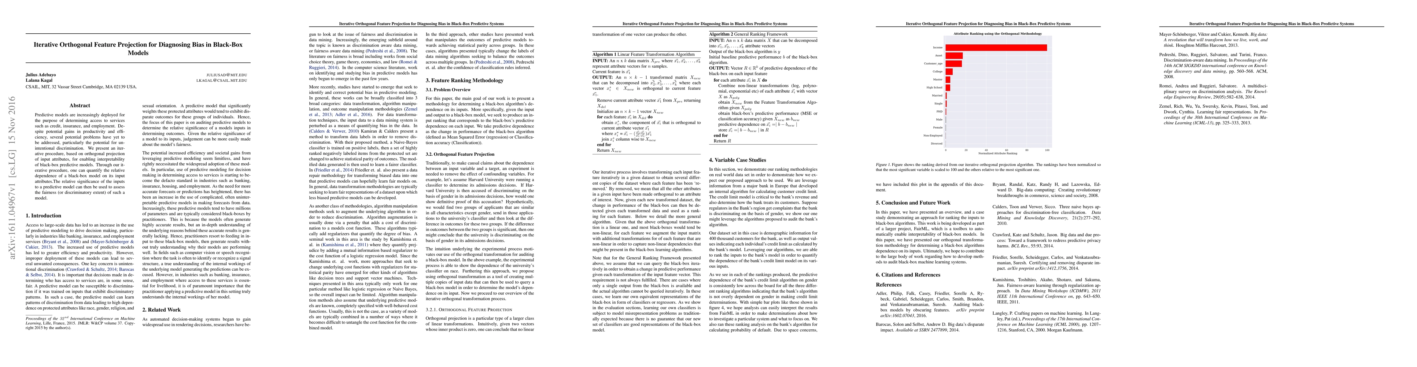 Predictive models are increasingly deployed for the purpose of determining access to services such as credit, insurance, and employment. Despite potential gains in productivity and efficiency, several potential problems have yet to be addressed, particularly the potential for unintentional discrimination. We present an iterative procedure, based on orthogonal projection of input attributes, for enabling interpretability of black-box predictive models. Through our iterative procedure, one can quantify the relative dependence of a black-box model on its input attributes.The relative significance of the inputs to a predictive model can then be used to assess the fairness (or discriminatory extent) of such a model.