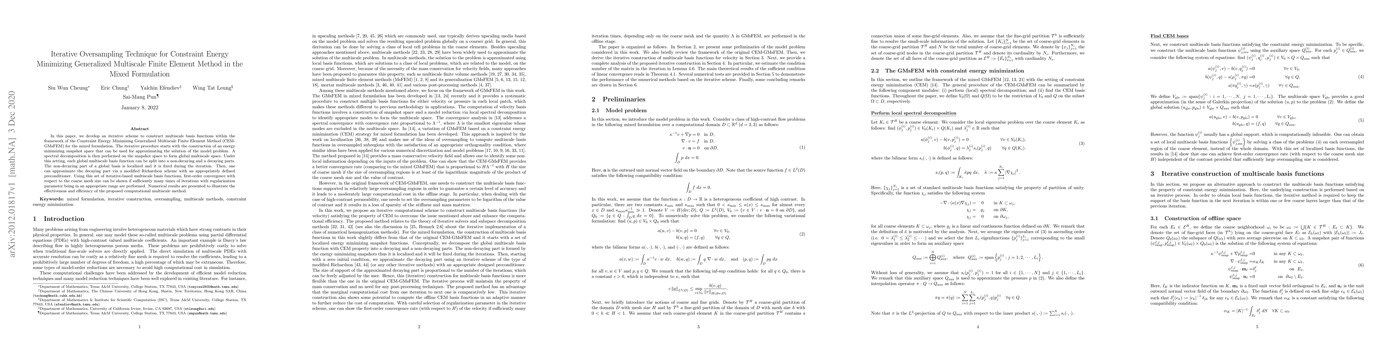 This paper proposes an iterative oversampling technique within the CEM-GMsFEM framework to construct multiscale basis functions for mixed formulation problems. The iterative scheme approximates the solution using a spectral decomposition of an energy minimizing snapshot space, achieving first-order convergence with appropriate regularization.