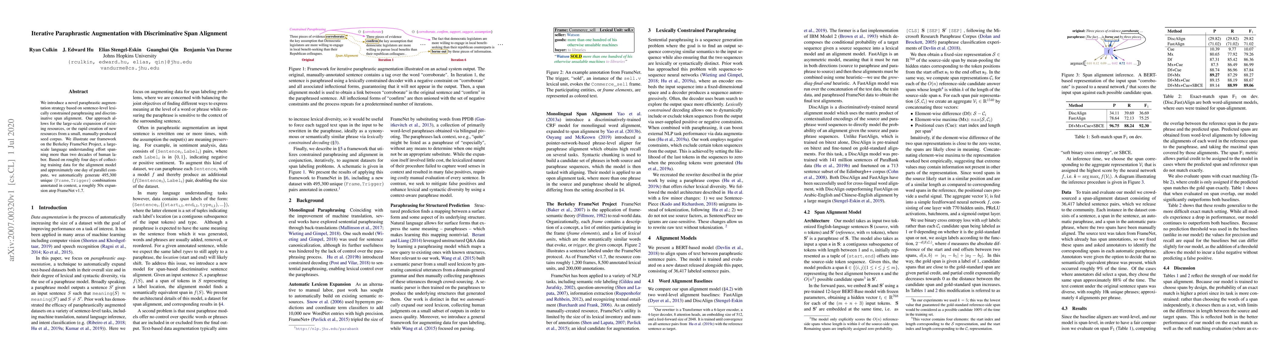 We introduce a novel paraphrastic augmentation strategy based on sentence-level lexically constrained paraphrasing and discriminative span alignment. Our approach allows for the large-scale expansion of existing resources, or the rapid creation of new resources from a small, manually-produced seed corpus. We illustrate our framework on the Berkeley FrameNet Project, a large-scale language understanding effort spanning more than two decades of human labor. Based on roughly four days of collecting training data for the alignment model and approximately one day of parallel compute, we automatically generate 495,300 unique (Frame, Trigger) combinations annotated in context, a roughly 50x expansion atop FrameNet v1.7.