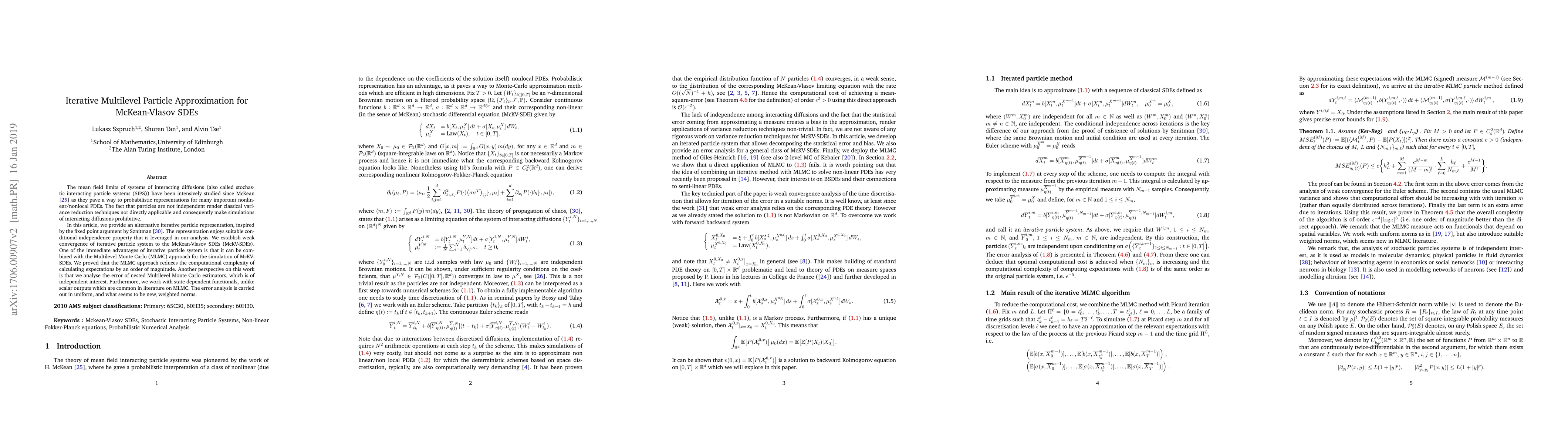The mean field limits of systems of interacting diffusions (also called stochastic interacting particle systems (SIPS)) have been intensively studied since McKean \cite{mckean1966class}. The interacting diffusions pave a way to probabilistic representations for many important nonlinear/nonlocal PDEs, but provide a great challenge for Monte Carlo simulations. This is due to the nonlinear dependence of the bias on the statistical error arising through the approximation of the law of the process. This and the fact that particles/diffusions are not independent render classical variance reduction techniques not directly applicable and consequently make simulations of interacting diffusions prohibitive. In this article, we provide an alternative iterative particle representation, inspired by the fixed point argument by Sznitman \cite{sznitman1991topics}. This new representation has the same mean field limit as the classical SIPS. However, unlike classical SIPS, it also allows decomposing the statistical error and the approximation bias. We develop a general framework to study integrability and regularity properties of the iterated particle system. Moreover, we establish its weak convergence to the McKean-Vlasov SDEs (MVSDEs). One of the immediate advantages of iterative particle system is that it can be combined with the Multilevel Monte Carlo (MLMC) approach for the simulation of MVSDEs. We proved that the MLMC approach reduces the computational complexity of calculating expectations by an order of magnitude. Another perspective on this work is that we analyse the error of nested Multilevel Monte Carlo estimators, which is of independent interest. Furthermore, we work with state dependent functionals, unlike scalar outputs which are common in literature on MLMC. The error analysis is carried out in uniform, and what seems to be new, weighted norms.