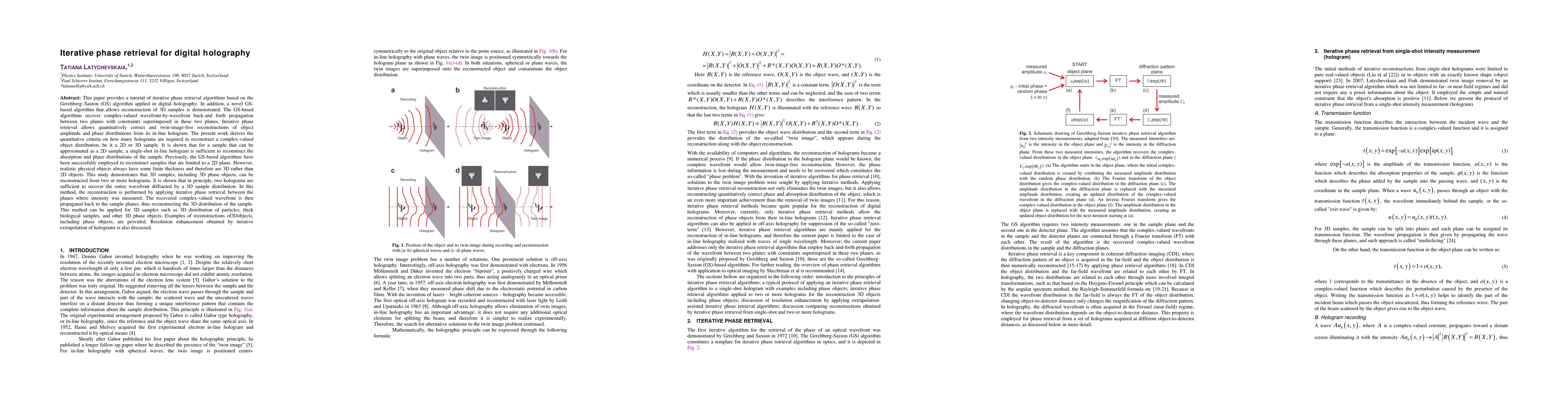 This paper provides a tutorial of iterative phase retrieval algorithms based on the Gerchberg-Saxton (GS) algorithm applied in digital holography. In addition, a novel GS-based algorithm that allows reconstruction of 3D samples is demonstrated. The GS-based algorithms recover complex-valued wavefront by wavefront back-and forth propagation between two planes with constraints superimposed in these two planes. Iterative phase retrieval allows quantitatively correct and twin-image-free reconstructions of object amplitude and phase distributions from its in-line hologram. The present work derives the quantitative criteria on how many holograms are required to reconstruct a complex-valued object distribution, be it a 2D or 3D sample. It is shown that for a sample that can be approximated as a 2D sample, a single-shot in-line hologram is sufficient to reconstruct the absorption and phase distributions of the sample. Previously, the GS-based algorithms have been successfully employed to reconstruct samples that are limited to a 2D plane. However, realistic physical objects always have some finite thickness and therefore are 3D rather than 2D objects. This study demonstrates that 3D samples, including 3D phase objects, can be reconstructed from two or more holograms. It is shown that in principle, two holograms are sufficient to recover the entire wavefront diffracted by a 3D sample distribution. In this method, the reconstruction is performed by applying iterative phase retrieval between the planes where intensity was measured. The recovered complex-valued wavefront is then propagated back to the sample planes, thus reconstructing the 3D distribution of the sample. This method can be applied for 3D samples such as 3D distribution of particles, thick biological samples, and other 3D phase objects. Examples of reconstructions of 3D objects, including phase objects, are provided.