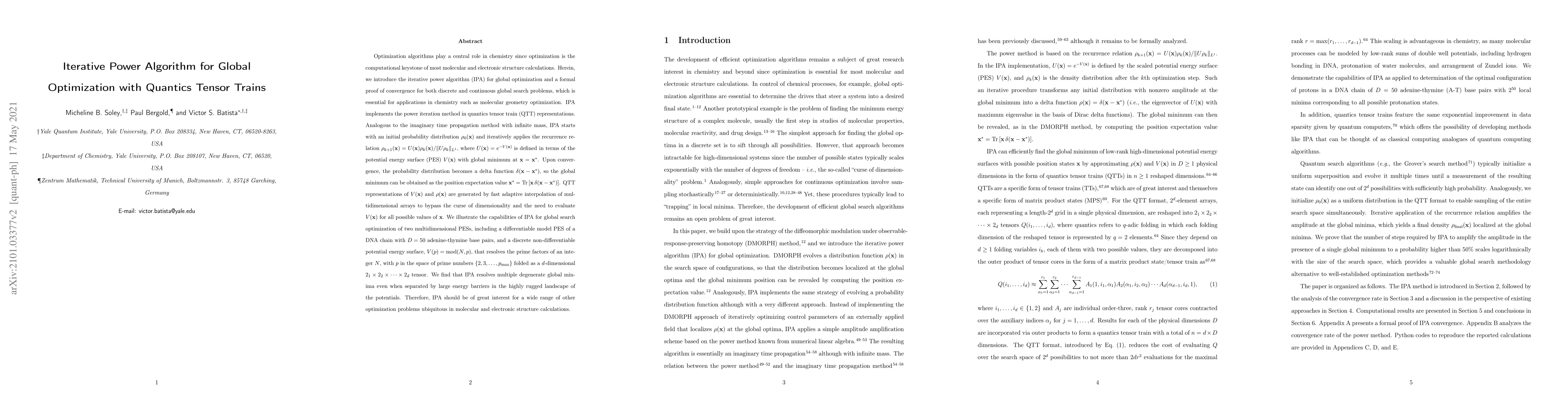 The paper introduces the iterative power algorithm (IPA) for global optimization, which leverages quantics tensor train (QTT) representations to efficiently handle high-dimensional problems. IPA converges to the global minimum by iteratively refining an initial probability distribution, proving effective for both differentiable and non-differentiable potential energy surfaces.