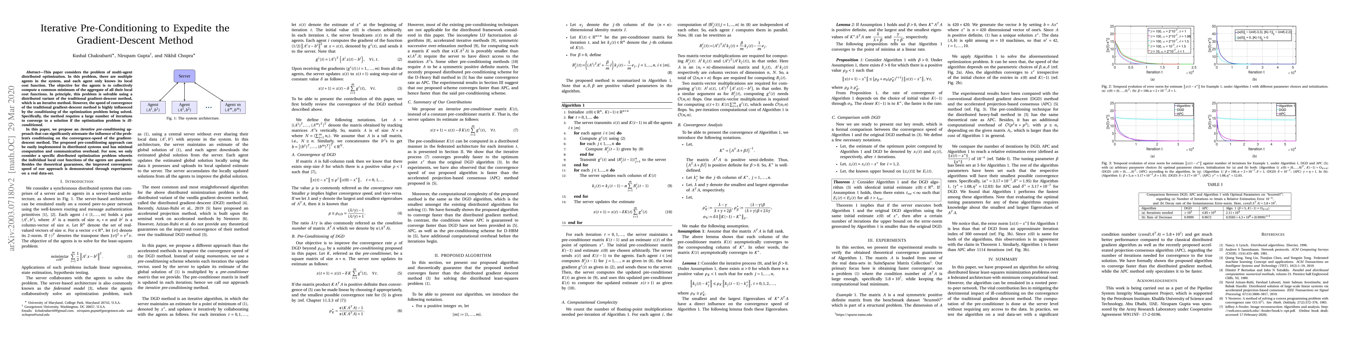 This paper proposes an iterative pre-conditioning method to accelerate the gradient-descent approach for multi-agent distributed optimization, addressing the slow convergence due to ill-conditioned problems. The method is shown to be effective with minimal overhead and is demonstrated through experiments on real data.