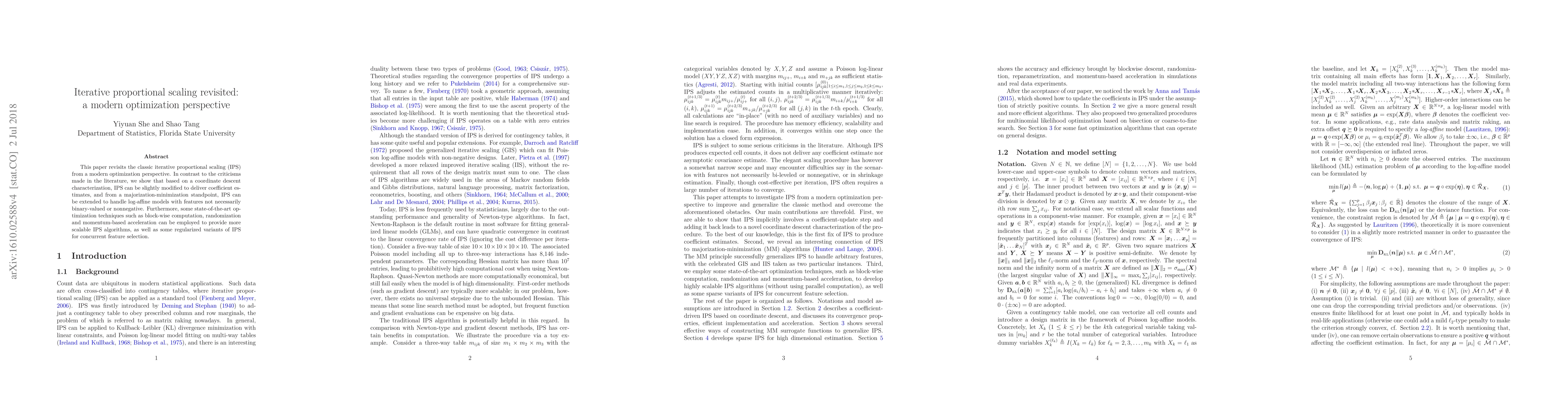 This paper modernizes iterative proportional scaling (IPS) using optimization techniques, showing it can yield coefficient estimates and handle log-affine models beyond binary or nonnegative features. It also introduces scalable algorithms and regularized variants for feature selection.