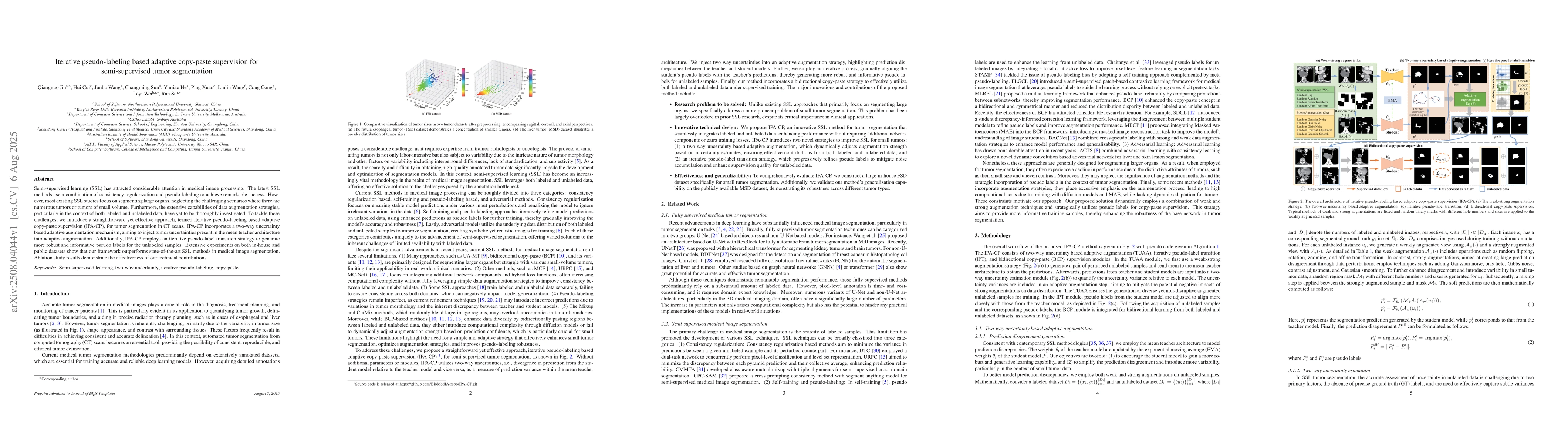 This research introduces Iterative Pseudo-labeling based Adaptive Copy-Paste Supervision (IPA-CP) for enhancing semi-supervised tumor segmentation in CT scans. IPA-CP uses an adaptive augmentation mechanism and an iterative pseudo-labeling strategy to generate robust pseudo-labels for unlabeled data, outperforming existing SSL methods in medical image segmentation.