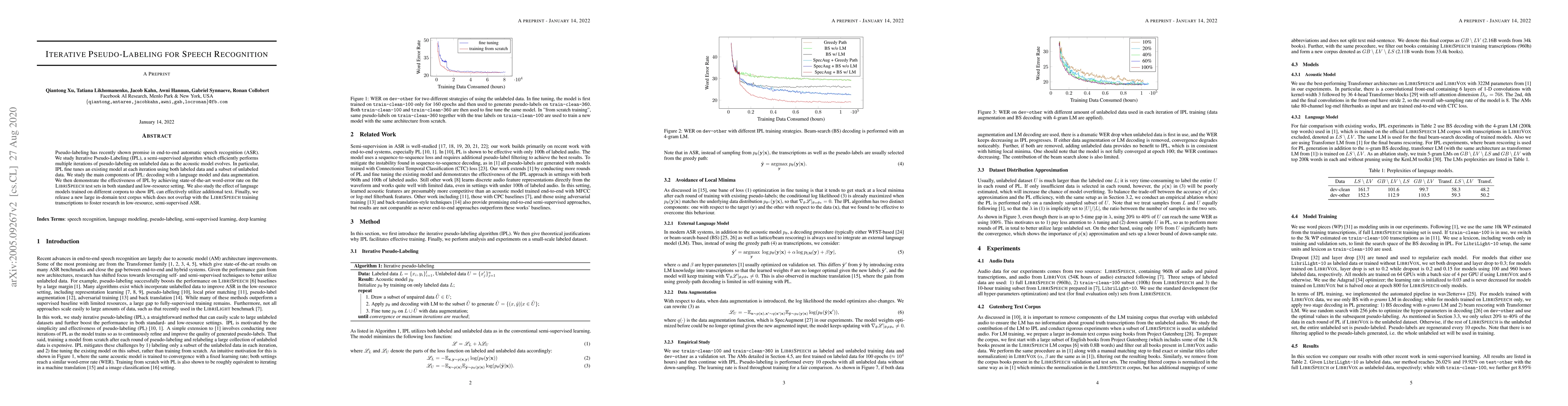Iterative Pseudo-Labeling (IPL) enhances speech recognition through semi-supervised learning by iteratively refining models using both labeled and pseudo-labeled data, achieving state-of-the-art results on Librispeech. The study also explores the impact of language models from different corpora and releases a new in-domain text corpus for low-resource ASR research.