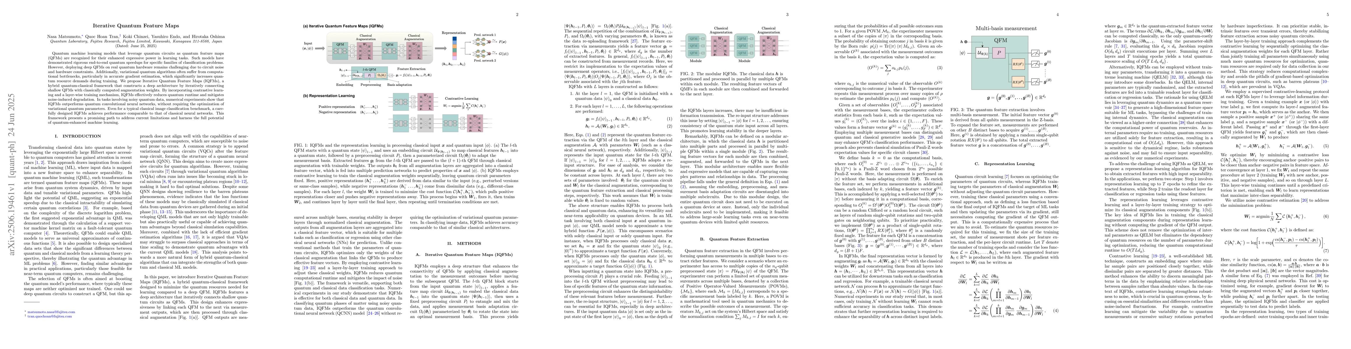 Quantum machine learning models that leverage quantum circuits as quantum feature maps (QFMs) are recognized for their enhanced expressive power in learning tasks. Such models have demonstrated rigorous end-to-end quantum speedups for specific families of classification problems. However, deploying deep QFMs on real quantum hardware remains challenging due to circuit noise and hardware constraints. Additionally, variational quantum algorithms often suffer from computational bottlenecks, particularly in accurate gradient estimation, which significantly increases quantum resource demands during training. We propose Iterative Quantum Feature Maps (IQFMs), a hybrid quantum-classical framework that constructs a deep architecture by iteratively connecting shallow QFMs with classically computed augmentation weights. By incorporating contrastive learning and a layer-wise training mechanism, IQFMs effectively reduces quantum runtime and mitigates noise-induced degradation. In tasks involving noisy quantum data, numerical experiments show that IQFMs outperforms quantum convolutional neural networks, without requiring the optimization of variational quantum parameters. Even for a typical classical image classification benchmark, a carefully designed IQFMs achieves performance comparable to that of classical neural networks. This framework presents a promising path to address current limitations and harness the full potential of quantum-enhanced machine learning.