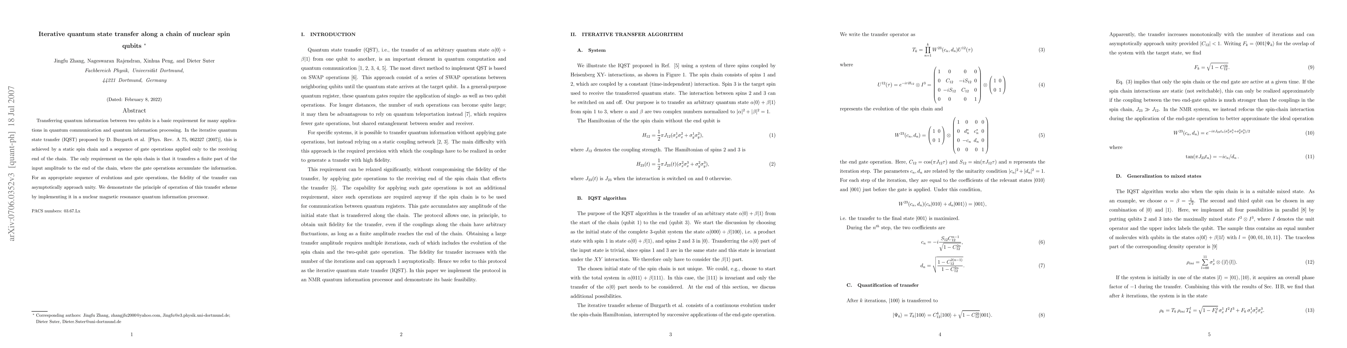 Transferring quantum information between two qubits is a basic requirement for many applications in quantum communication and quantum information processing. In the iterative quantum state transfer (IQST) proposed by D. Burgarth et al. [Phys. Rev. A 75, 062327 (2007)], this is achieved by a static spin chain and a sequence of gate operations applied only to the receiving end of the chain. The only requirement on the spin chain is that it transfers a finite part of the input amplitude to the end of the chain, where the gate operations accumulate the information. For an appropriate sequence of evolutions and gate operations, the fidelity of the transfer can asymptotically approach unity. We demonstrate the principle of operation of this transfer scheme by implementing it in a nuclear magnetic resonance quantum information processor.
