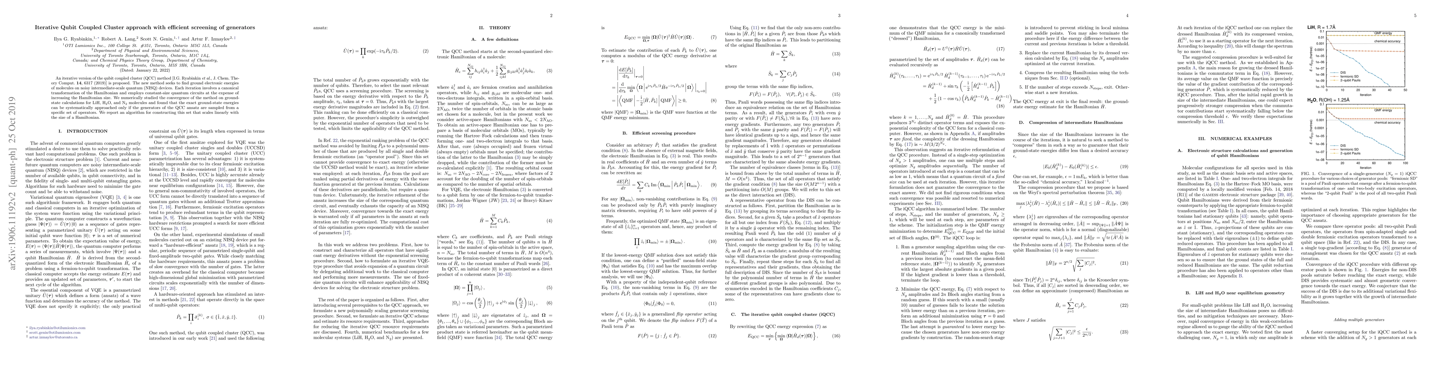 This paper proposes an iterative qubit coupled cluster (QCC) method for ground-state energy calculations on NISQ devices, demonstrating convergence through numerical studies on LiH, H$_2$O, and N$_2$. It introduces an efficient algorithm for selecting a specific set of QCC ansatz generators that scales linearly with Hamiltonian size.