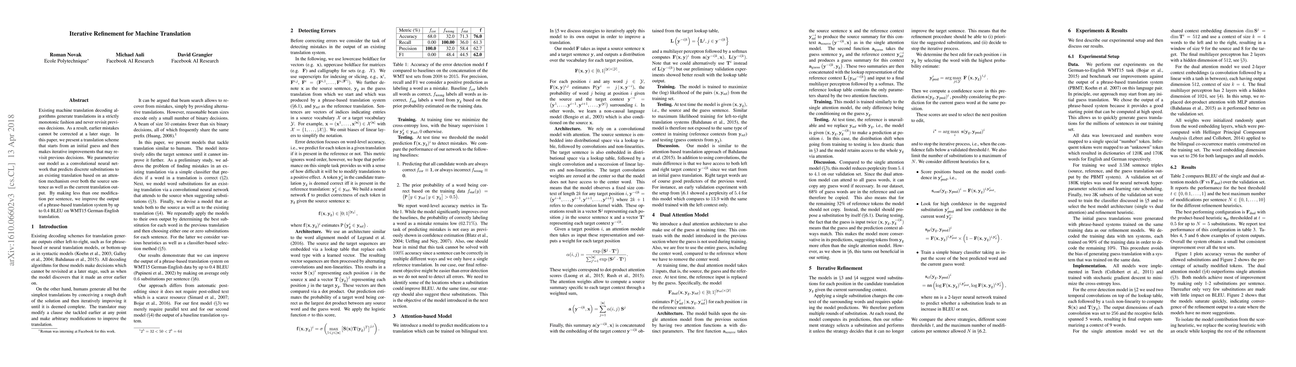A new machine translation approach refines initial guesses through iterative improvements, revisiting previous decisions to correct mistakes, improving output by up to 0.4 BLEU.