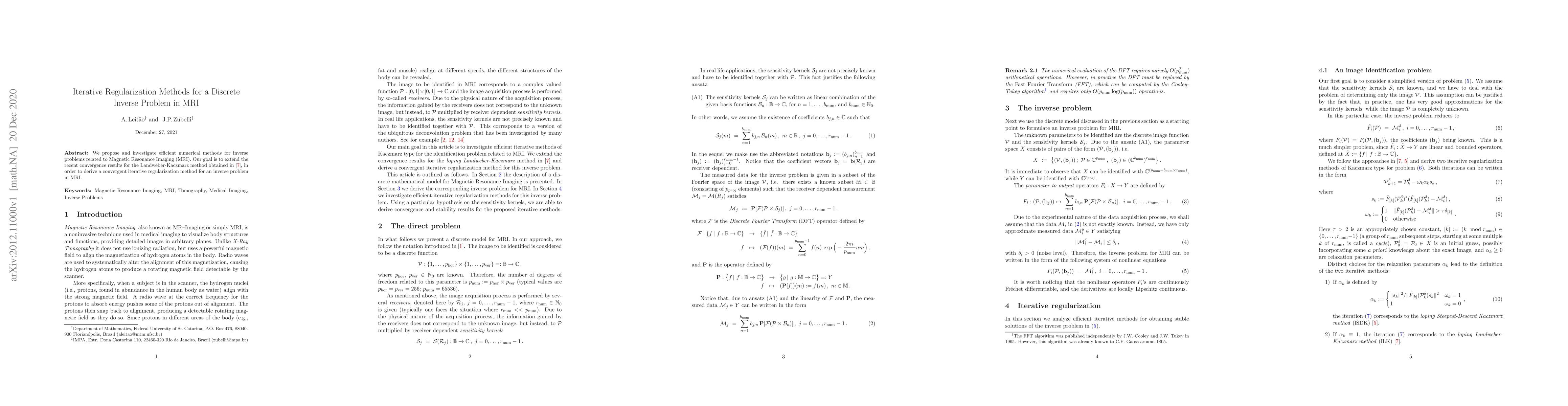 This paper proposes efficient numerical methods for solving inverse problems in MRI, extending recent convergence results for the Landweber-Kaczmarz method to develop a convergent iterative regularization technique for MRI inverse problems.