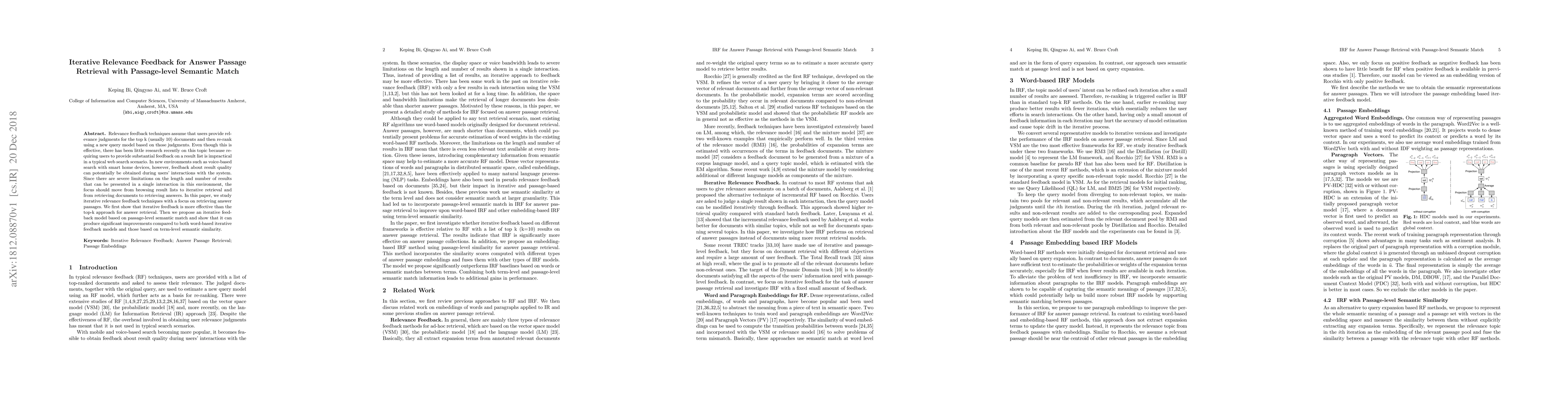Relevance feedback techniques assume that users provide relevance judgments for the top k (usually 10) documents and then re-rank using a new query model based on those judgments. Even though this is effective, there has been little research recently on this topic because requiring users to provide substantial feedback on a result list is impractical in a typical web search scenario. In new environments such as voice-based search with smart home devices, however, feedback about result quality can potentially be obtained during users' interactions with the system. Since there are severe limitations on the length and number of results that can be presented in a single interaction in this environment, the focus should move from browsing result lists to iterative retrieval and from retrieving documents to retrieving answers. In this paper, we study iterative relevance feedback techniques with a focus on retrieving answer passages. We first show that iterative feedback is more effective than the top-k approach for answer retrieval. Then we propose an iterative feedback model based on passage-level semantic match and show that it can produce significant improvements compared to both word-based iterative feedback models and those based on term-level semantic similarity.