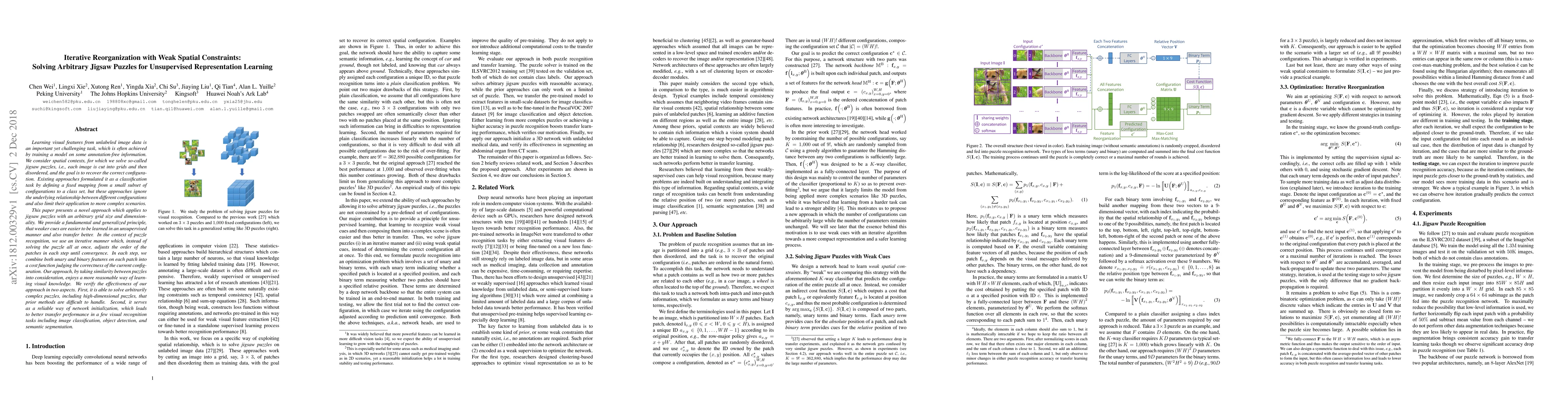 Learning visual features from unlabeled image data is an important yet challenging task, which is often achieved by training a model on some annotation-free information. We consider spatial contexts, for which we solve so-called jigsaw puzzles, i.e., each image is cut into grids and then disordered, and the goal is to recover the correct configuration. Existing approaches formulated it as a classification task by defining a fixed mapping from a small subset of configurations to a class set, but these approaches ignore the underlying relationship between different configurations and also limit their application to more complex scenarios. This paper presents a novel approach which applies to jigsaw puzzles with an arbitrary grid size and dimensionality. We provide a fundamental and generalized principle, that weaker cues are easier to be learned in an unsupervised manner and also transfer better. In the context of puzzle recognition, we use an iterative manner which, instead of solving the puzzle all at once, adjusts the order of the patches in each step until convergence. In each step, we combine both unary and binary features on each patch into a cost function judging the correctness of the current configuration. Our approach, by taking similarity between puzzles into consideration, enjoys a more reasonable way of learning visual knowledge. We verify the effectiveness of our approach in two aspects. First, it is able to solve arbitrarily complex puzzles, including high-dimensional puzzles, that prior methods are difficult to handle. Second, it serves as a reliable way of network initialization, which leads to better transfer performance in a few visual recognition tasks including image classification, object detection, and semantic segmentation.