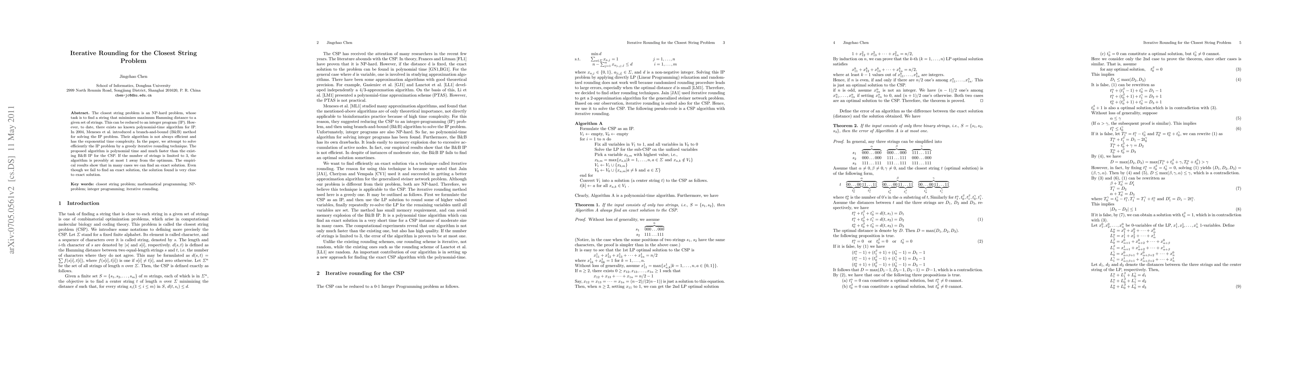 This paper proposes a polynomial-time iterative rounding algorithm to solve the NP-hard closest string problem efficiently. The new method outperforms existing branch-and-bound techniques and is particularly effective when the number of strings is limited to three, often finding solutions within one Hamming distance of the optimal.