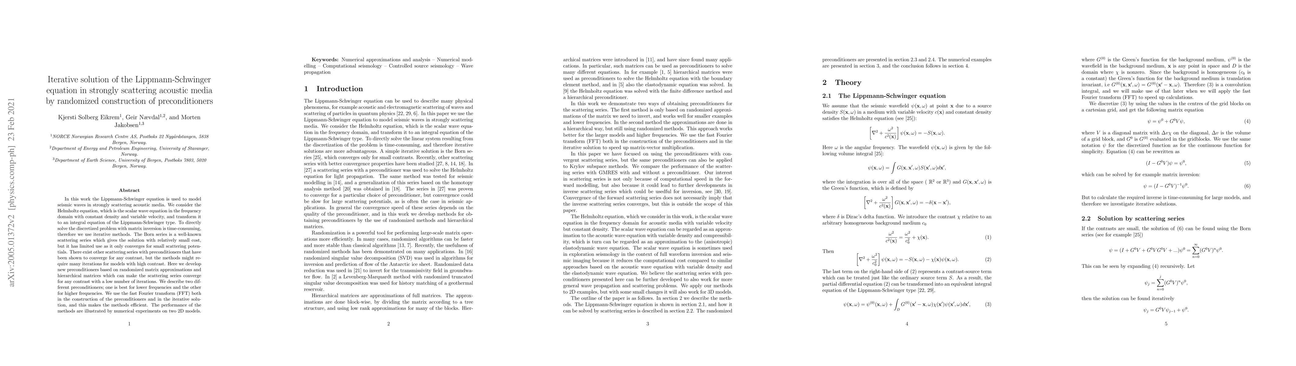 This paper proposes iterative methods to solve the Lippmann-Schwinger equation for modeling seismic waves in strongly scattering acoustic media, using randomized preconditioners to improve convergence. Numerical experiments show efficient performance on 2D models.