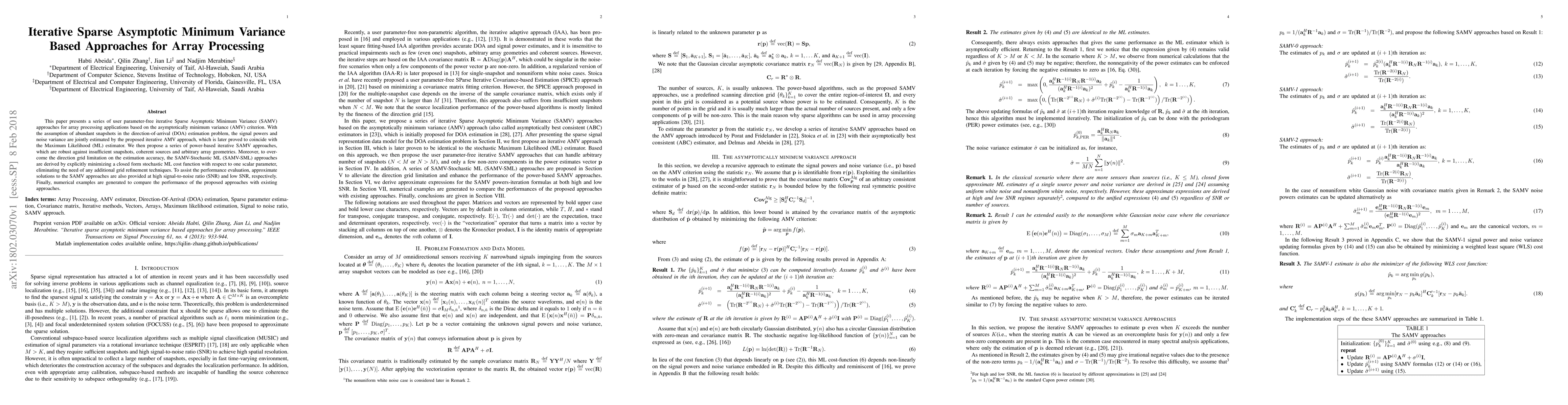 This paper presents a series of user parameter-free iterative Sparse Asymptotic Minimum Variance (SAMV) approaches for array processing applications based on the asymptotically minimum variance (AMV) criterion. With the assumption of abundant snapshots in the direction-of-arrival (DOA) estimation problem, the signal powers and noise variance are jointly estimated by the proposed iterative AMV approach, which is later proved to coincide with the Maximum Likelihood (ML) estimator. We then propose a series of power-based iterative SAMV approaches, which are robust against insufficient snapshots, coherent sources and arbitrary array geometries. Moreover, to overcome the direction grid limitation on the estimation accuracy, the SAMV-Stochastic ML (SAMV-SML) approaches are derived by explicitly minimizing a closed form stochastic ML cost function with respect to one scalar parameter, eliminating the need of any additional grid refinement techniques. To assist the performance evaluation, approximate solutions to the SAMV approaches are also provided at high signal-to-noise ratio (SNR) and low SNR, respectively. Finally, numerical examples are generated to compare the performance of the proposed approaches with existing approaches.