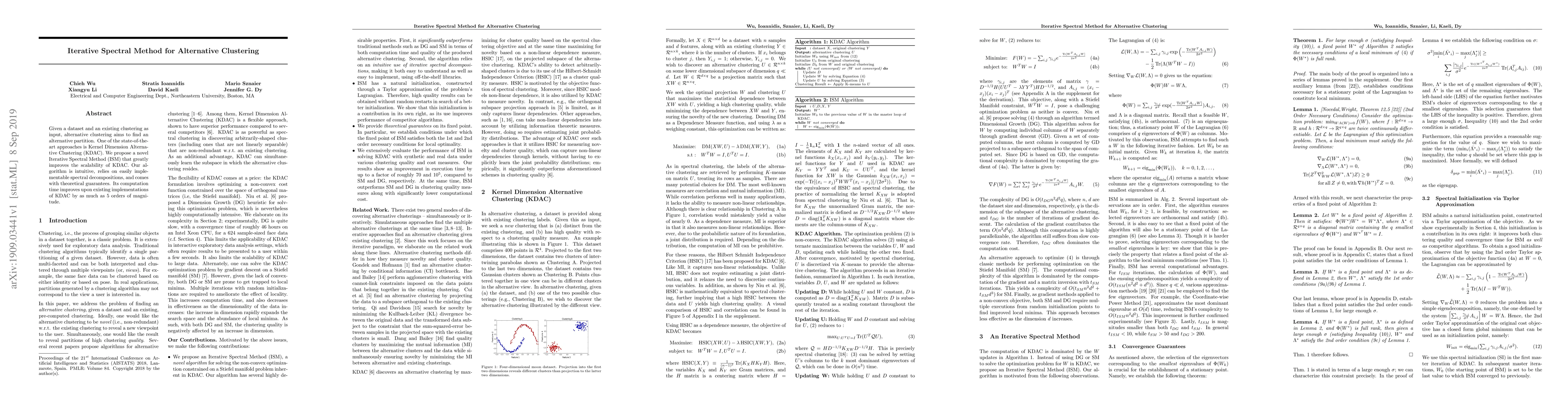 The paper proposes an Iterative Spectral Method (ISM) to enhance the scalability of Kernel Dimension Alternative Clustering (KDAC), significantly reducing computation time by up to 5 orders of magnitude while maintaining theoretical guarantees.
