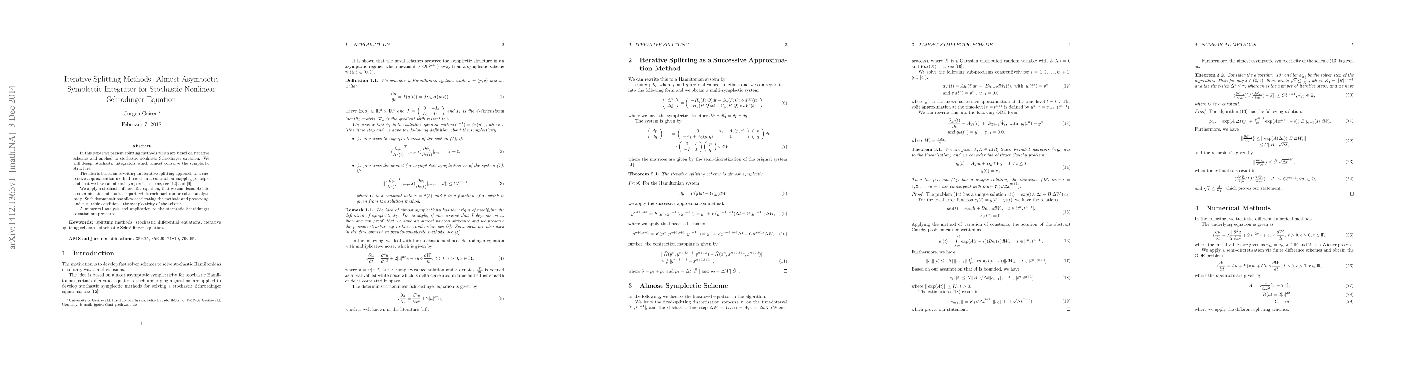 In this paper we present splitting methods which are based on iterative schemes and applied to stochastic nonlinear Schroedinger equation. We will design stochastic integrators which almost conserve the symplectic structure. The idea is based on rewriting an iterative splitting approach as a successive approximation method based on a contraction mapping principle and that we have an almost symplectic scheme. We apply a stochastic differential equation, that we can decouple into a deterministic and stochatic part, while each part can be solved analytically. Such decompositions allow accelerating the methods and preserving, under suitable conditions, the symplecticity of the schemes. A numerical analysis and application to the stochastic Schroedinger equation are presented.