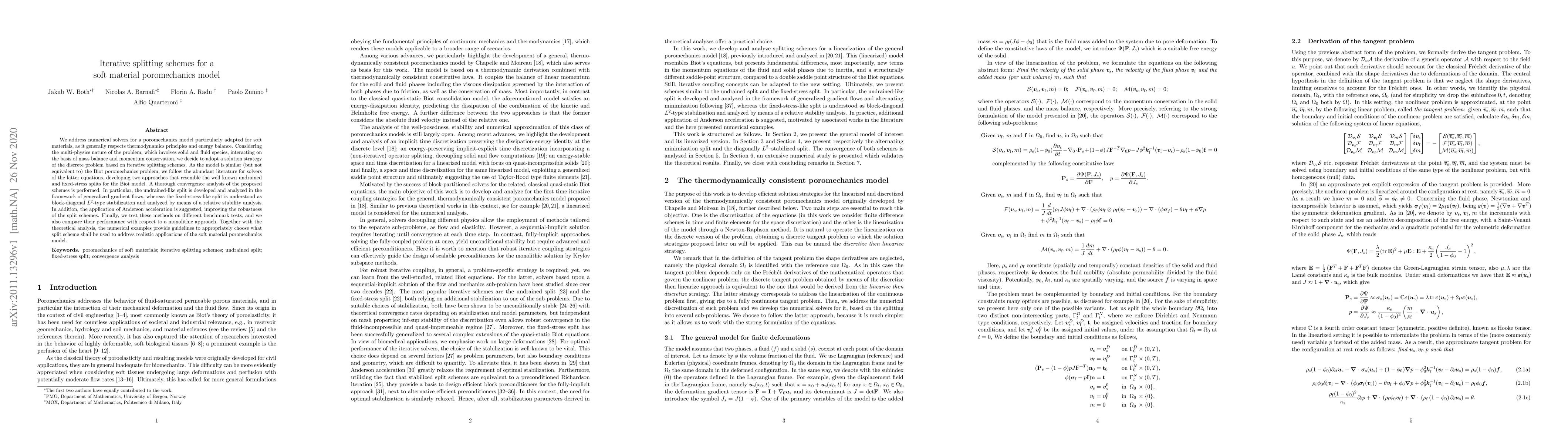 This research paper develops iterative splitting schemes for a poromechanics model of soft materials, improving convergence and robustness with methods like Anderson acceleration, and comparing performance to monolithic approaches.